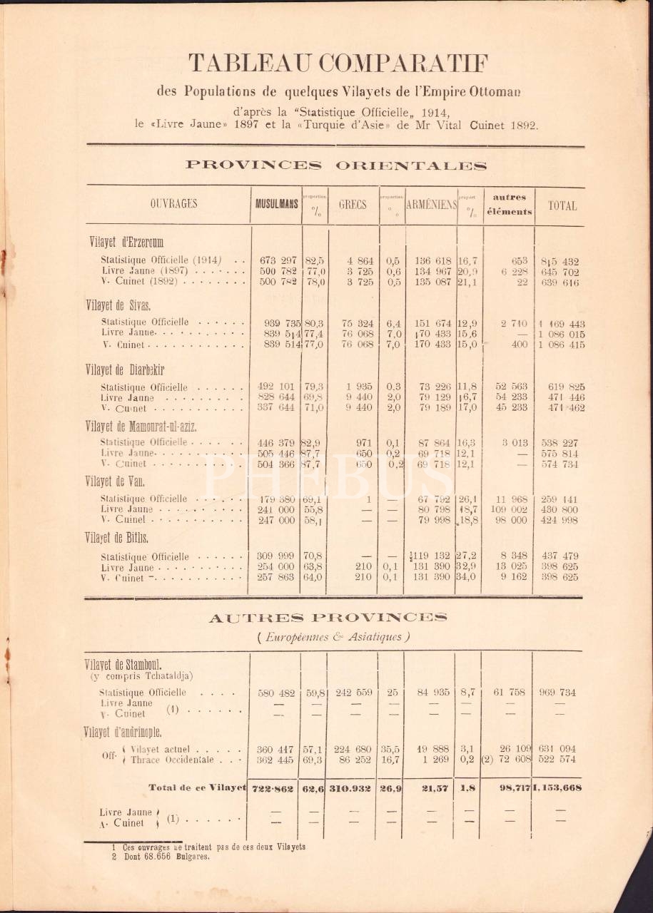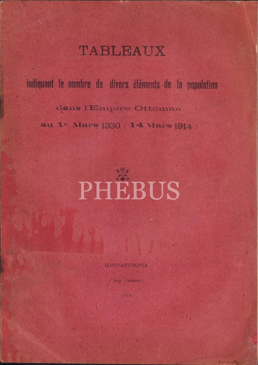 Osmanlı İmparatorluğu döneminde yaşayan Ermeni, Rum, Yahudi vs. azınlıklara dair demografik bilgileri ihtiva eden Fransızca Osmanlı İmparatorluğu'nun 1914 Nüfus İstatistikleri, 1919 baskı, Constantinople, 16 sayfa, 23x30 cm