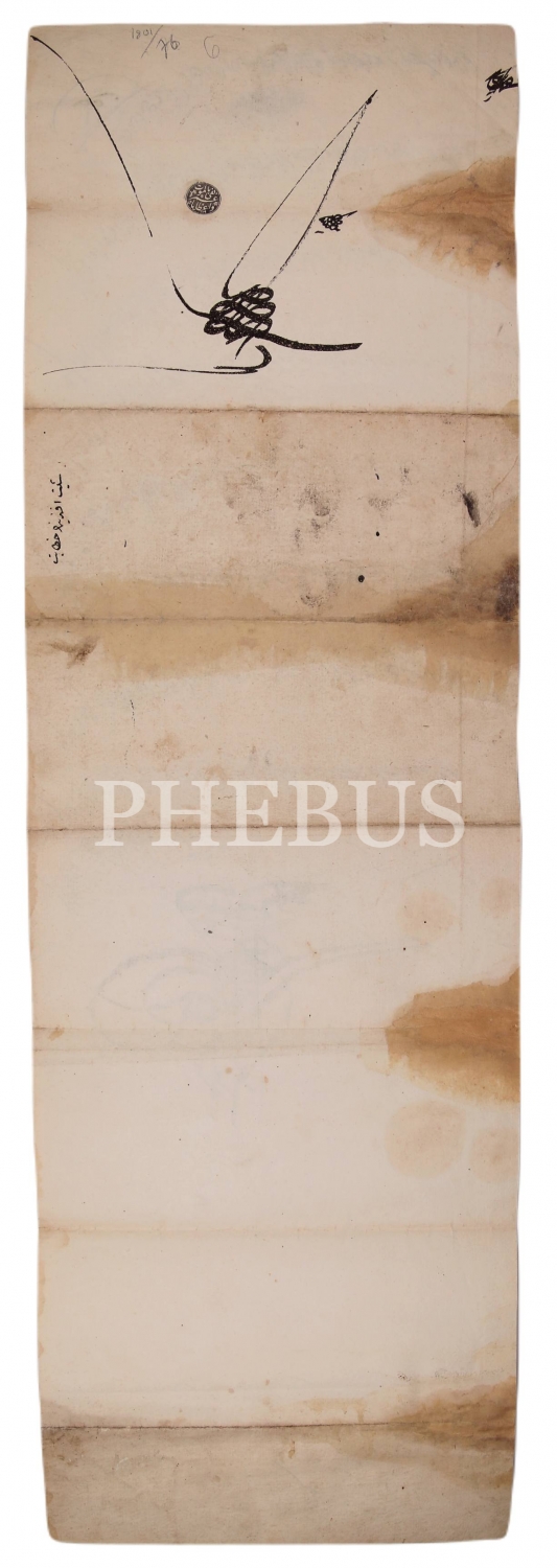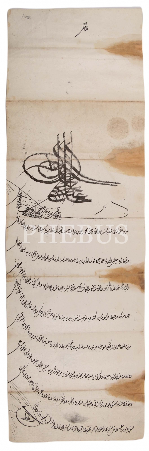 Kalkandelen kasabasındaki caminin tahsisatı ve imam-hatibe verilecek günlük akçe hakkında. I. Abdülhamid tuğralı el çekme berat, 23x75 cm, haliyle