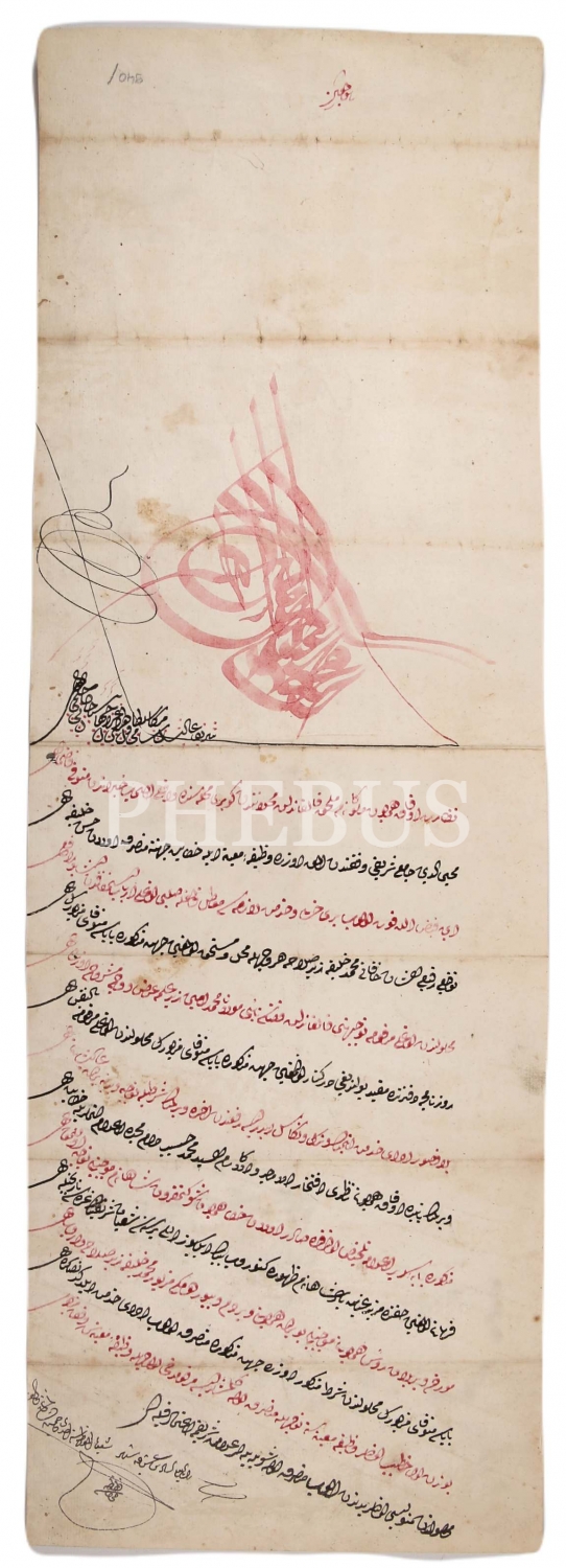 Kalkandelen Hacı Muhiddin Camii'nin mülhak vakfı ile ilgili II. Mahmud tuğralı el çekme berat, 1251 tarihli, 24x72 cm, haliyle