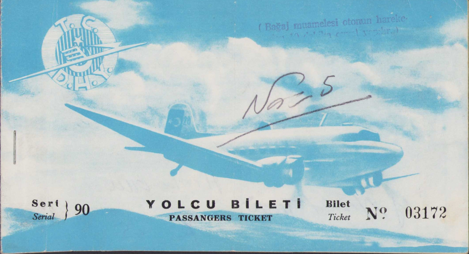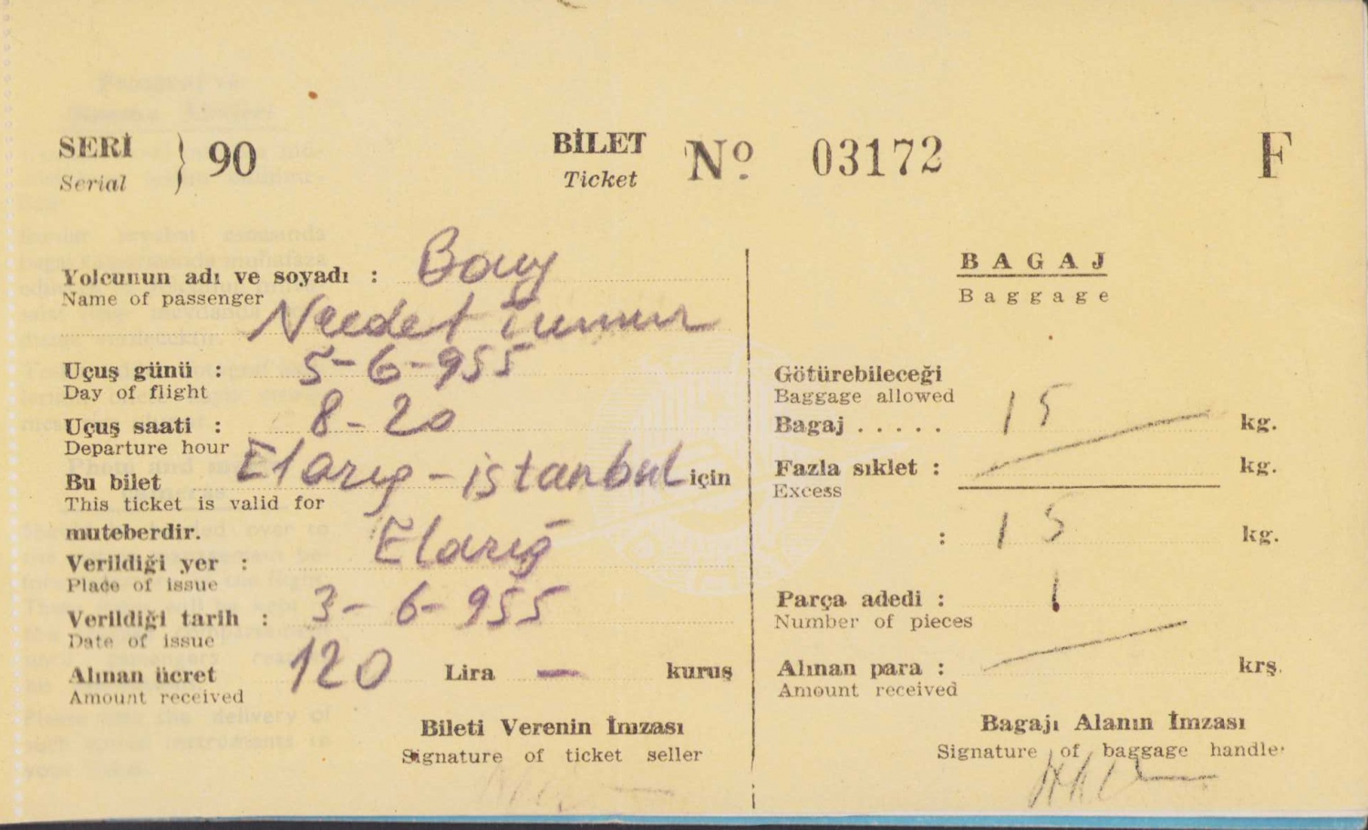Devlet Hava Yolları yolcu bileti, 1955 tarihli, Elaziz-İstanbul seferi, 18x10 cm