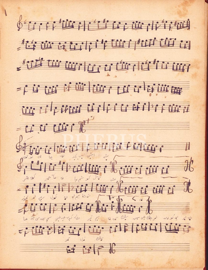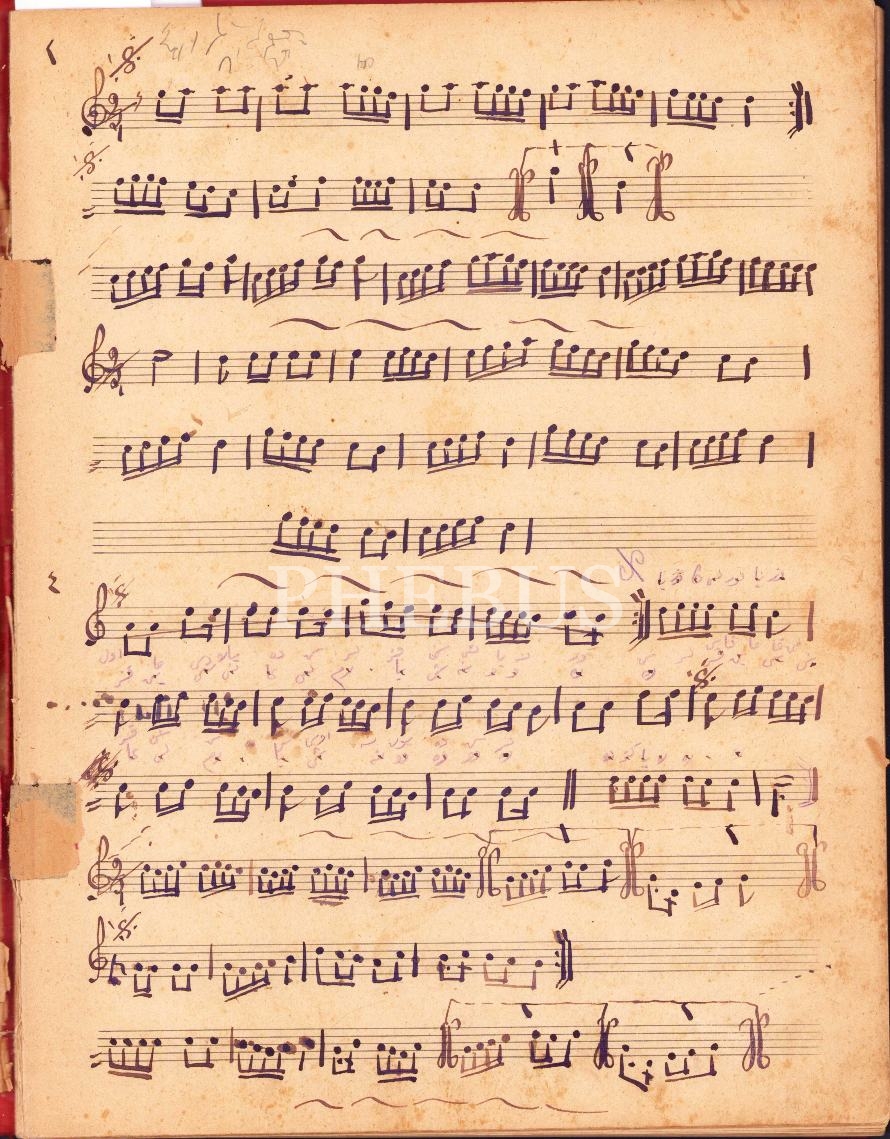 El Yazısı Osmanlıca Nota Defteri, içerisinde muhtelif peşrev ve kanto notaları mevcut, 9 sayfa yazılı, Fransızca "Musique" yazılı kırmızı cildinde, 26x34 cm