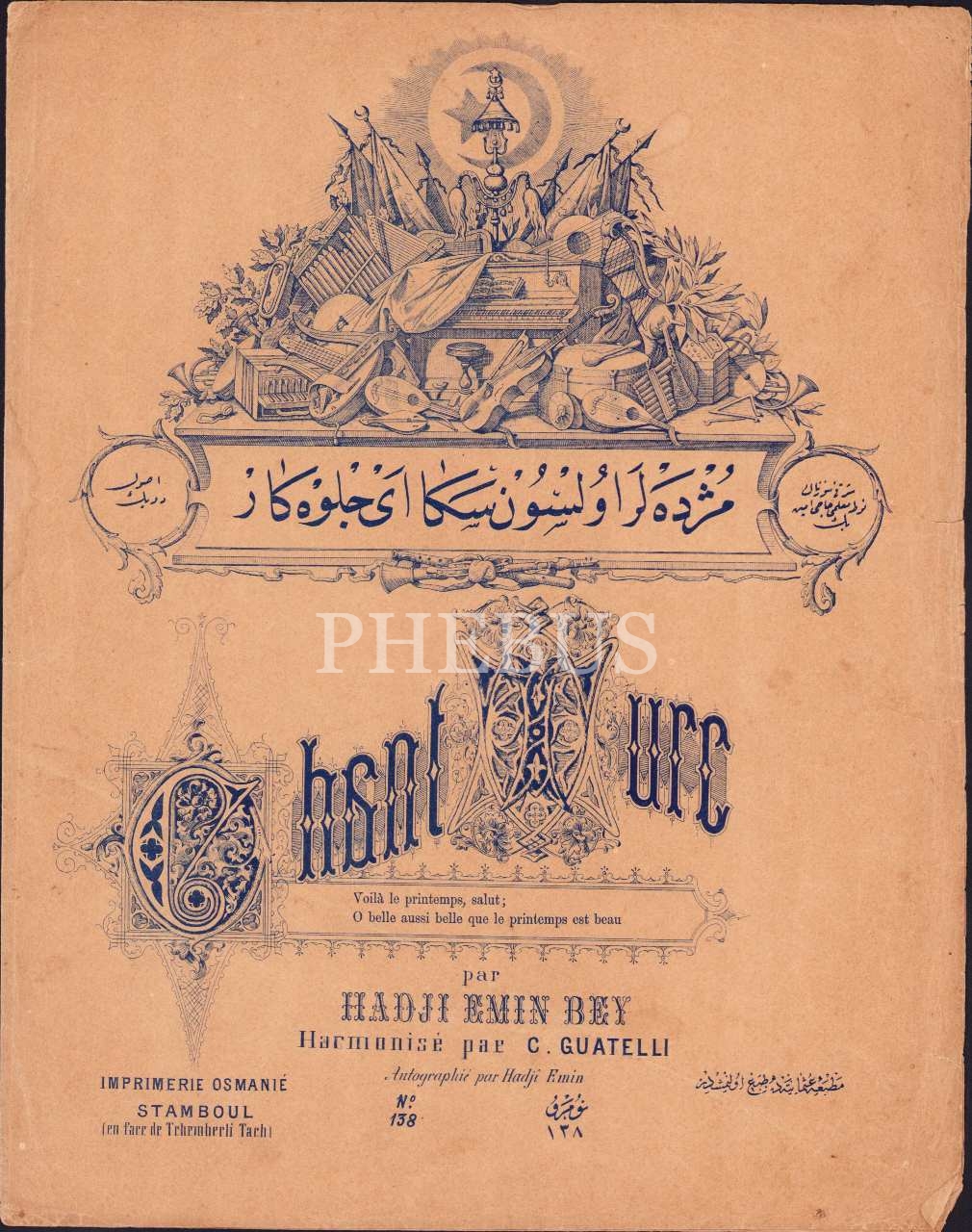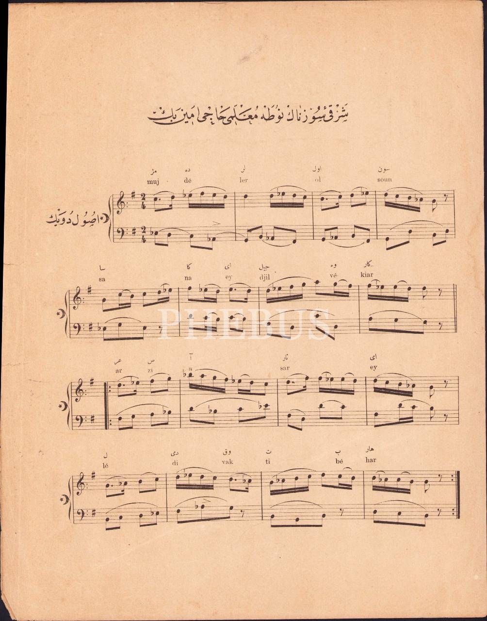 Osmanlı Nota Yayıncılığını Başlatan Hacı Emin Efendi Notalarından: Müjdeler Olsun Sana Ey Cilvekar, Suzinak Şarkı, 4 sayfa, Osmanlıca, Matbaa-i Osmaniye, 27x35 cm