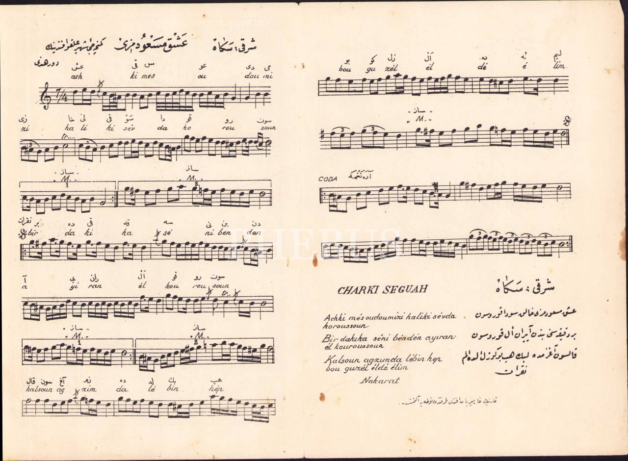 Osmanlı Dönemi Şamlı İskender Yayını Notalarından: Aşk-ı Mesudumuzu Halık-ı Sevda Korusun, Bestekar: Aleko Bacanos, Segah Şarkı, 3 sayfa, 15x20 cm