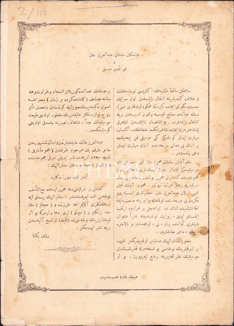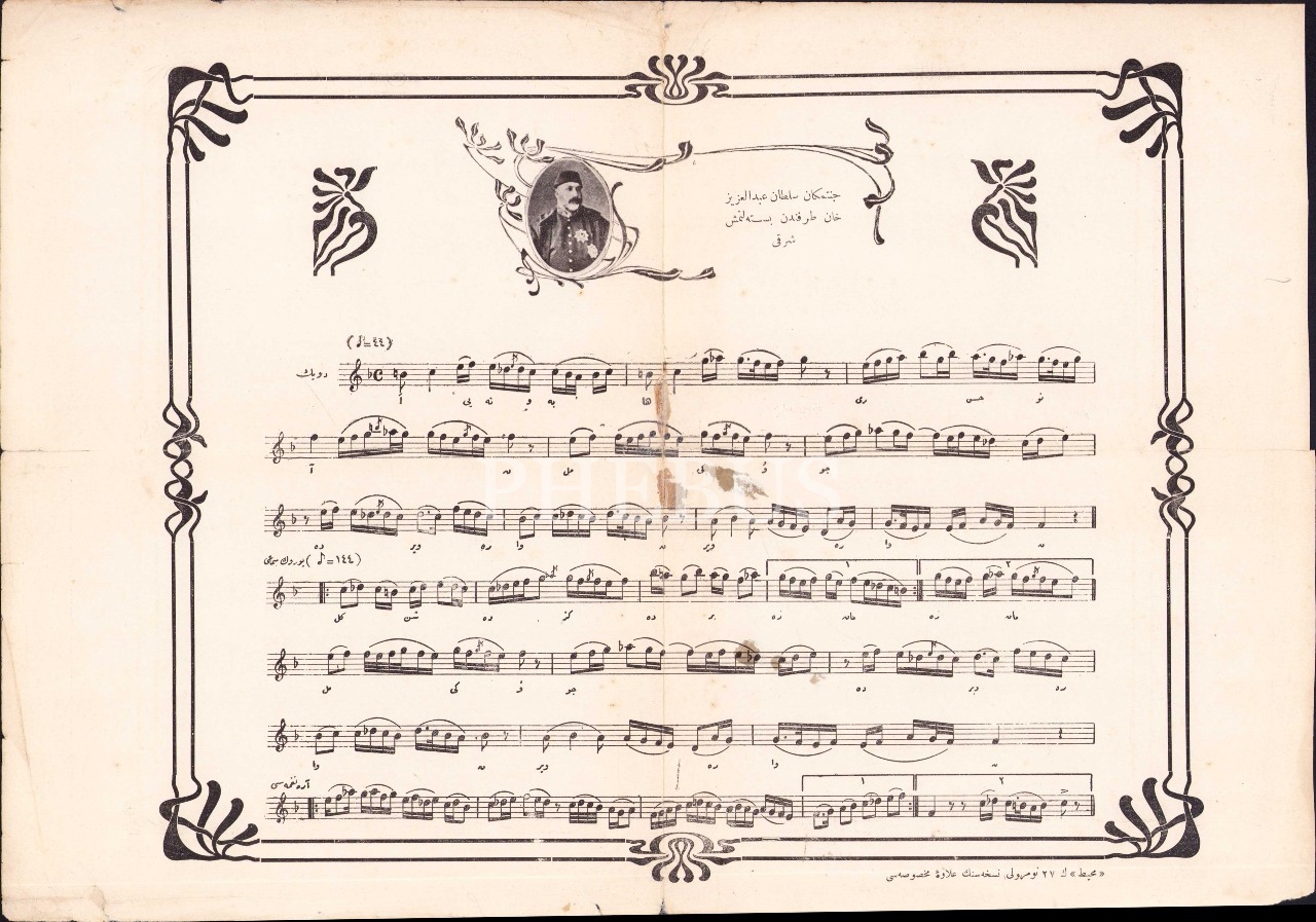 Sultan Abdülaziz Han Tarafından Bestelenmiş Şevkefza Şarkı'nın Osmanlıca Matbu Notası, Muhit Mecmuası'nın İlavesi, 20x30 cm