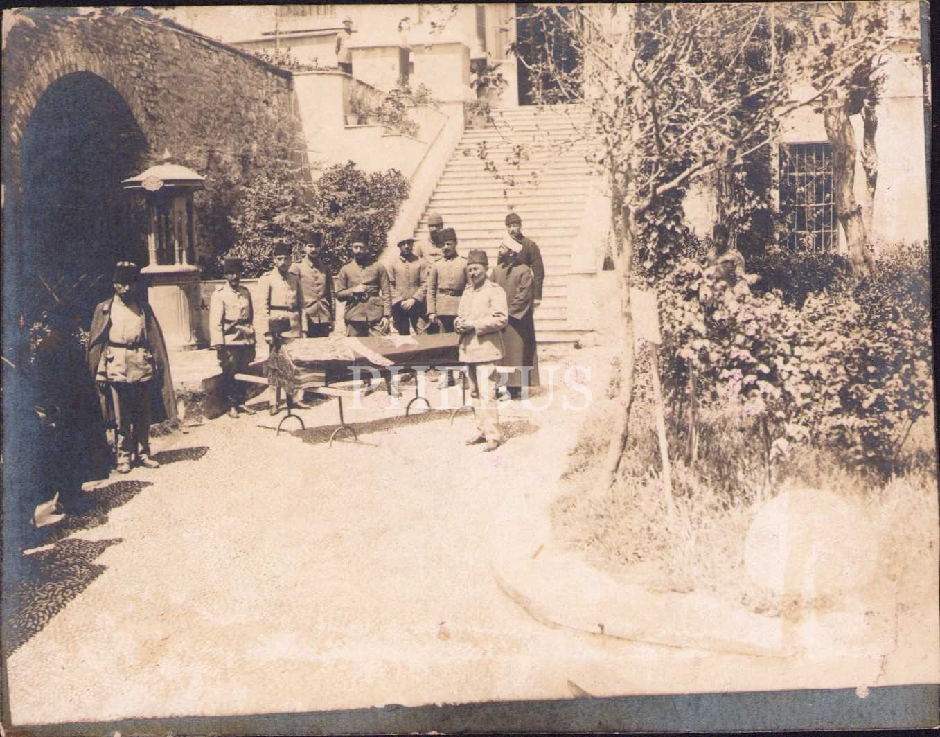 Üniformalı Askerler Cenazede, arkasında "Melih Celallerin evi" yazılı, 11x9 cm