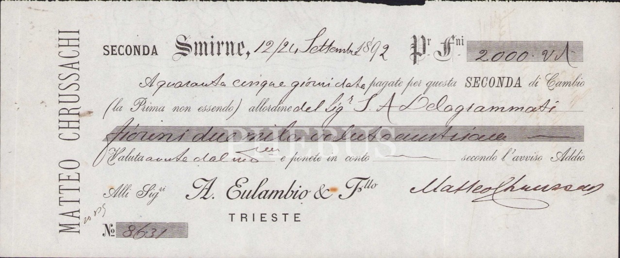 1892 tarihli Smirne [İzmir] yazılı İtalyanca çek, 28x11,5 cm