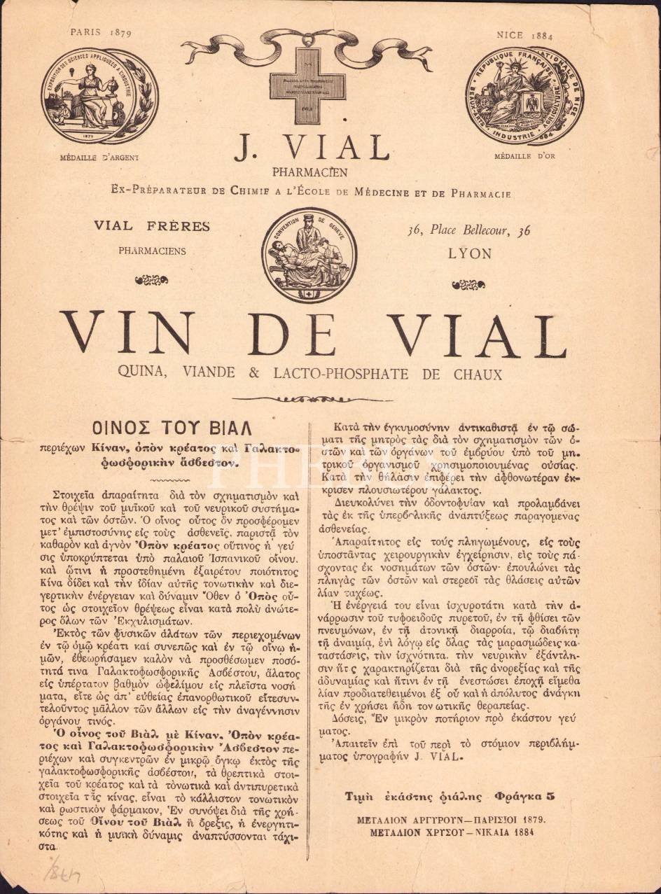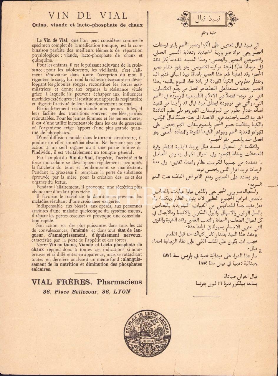 Vücuda Taze Hayat Bahş Eden "Viyal Şarabı"nın Osmanlıca, Fransızca, Arapça, Ermenice ve Rumca dört dilde broşürü, 4 sayfa, 22x30 cm