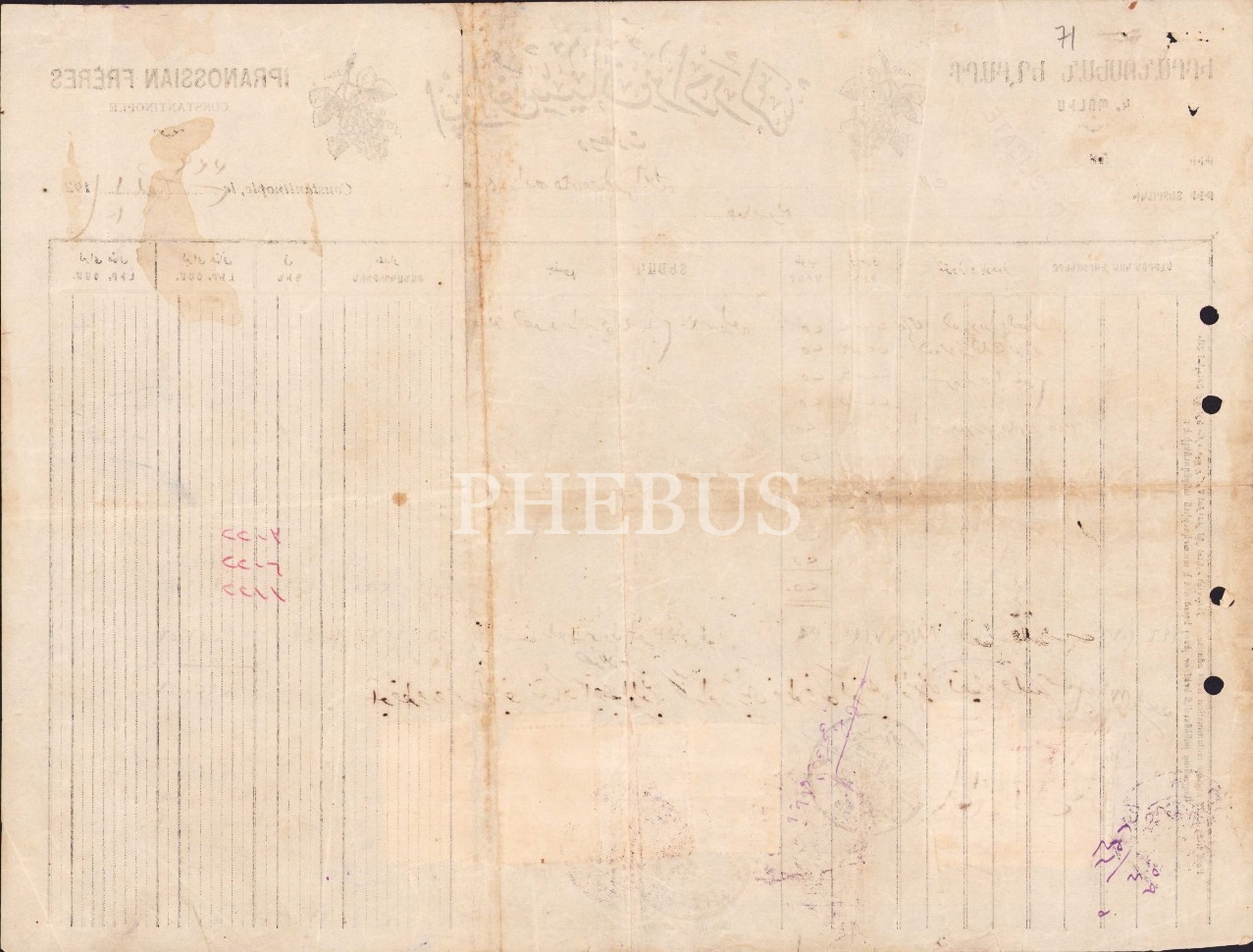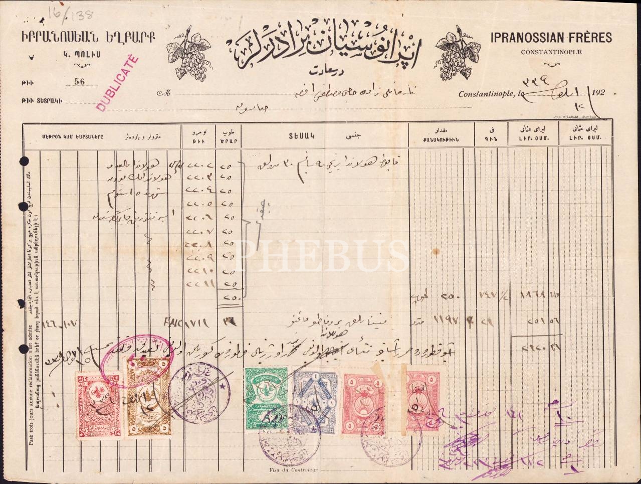 Dersaadet'te İpranossyan Biraderler antetli fatura, 1339 tarihli, Ermenice, Osmanlıca ve Fransızca, 35x27 cm