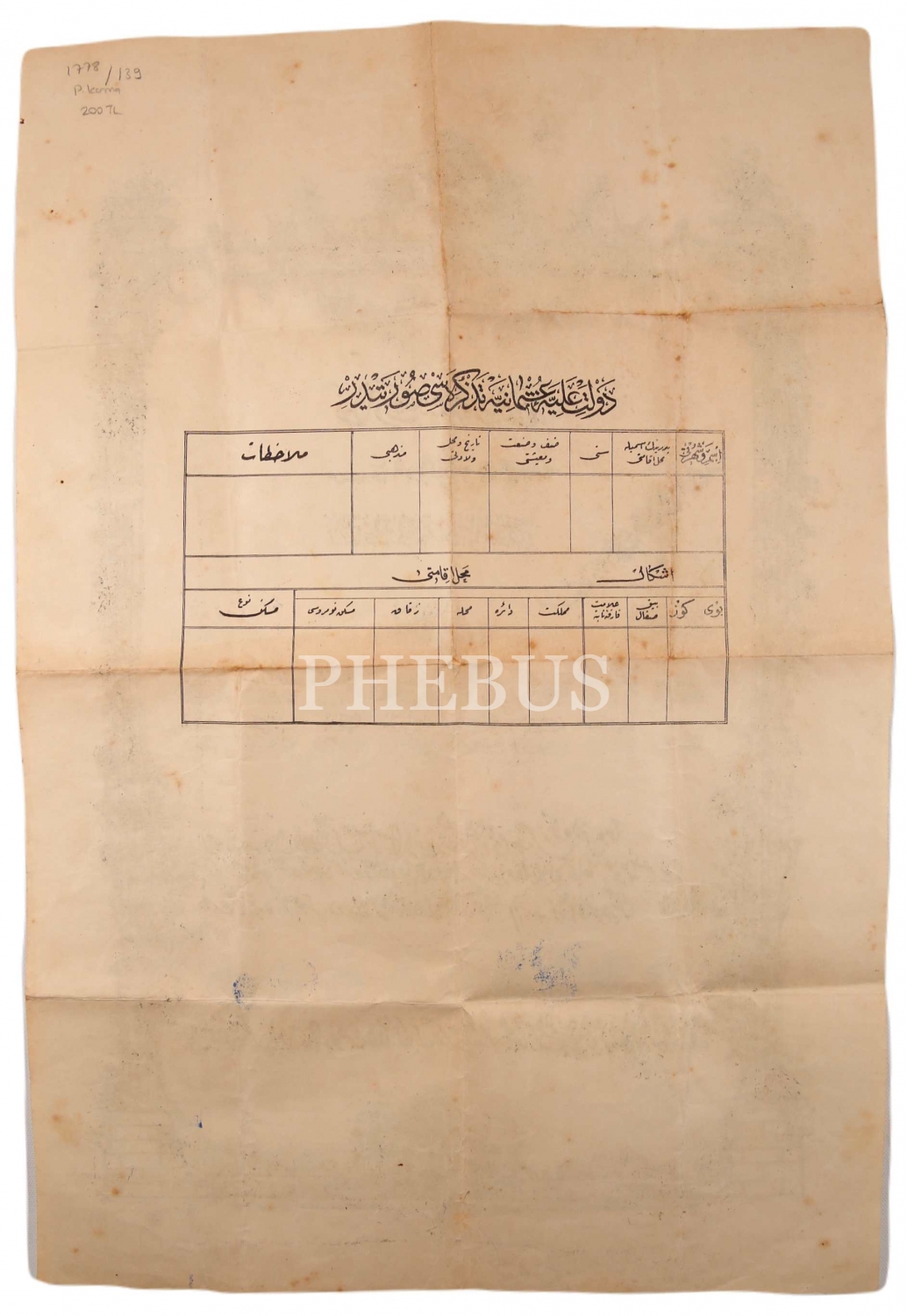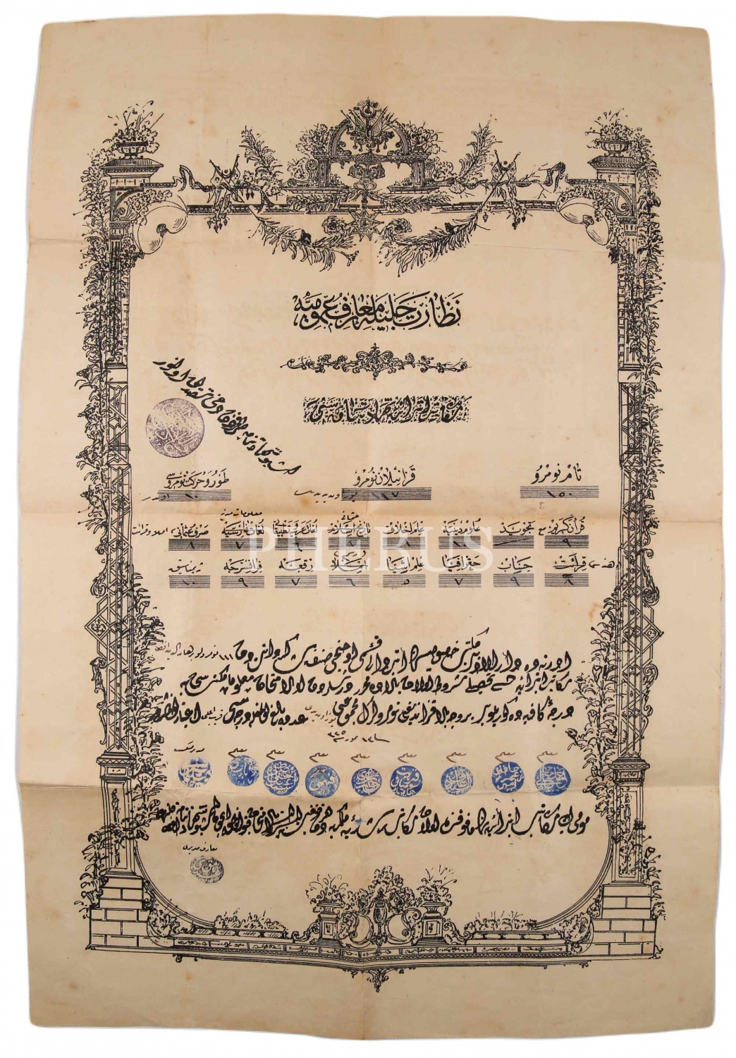 Osmanlıca Edirne'de Dârü'l- Mekteb-i Hususisi, 11 numaralı Burhaneddin Efendi'ye ait 13 Temmuz 1325 tarihli diploma, 33x49 cm