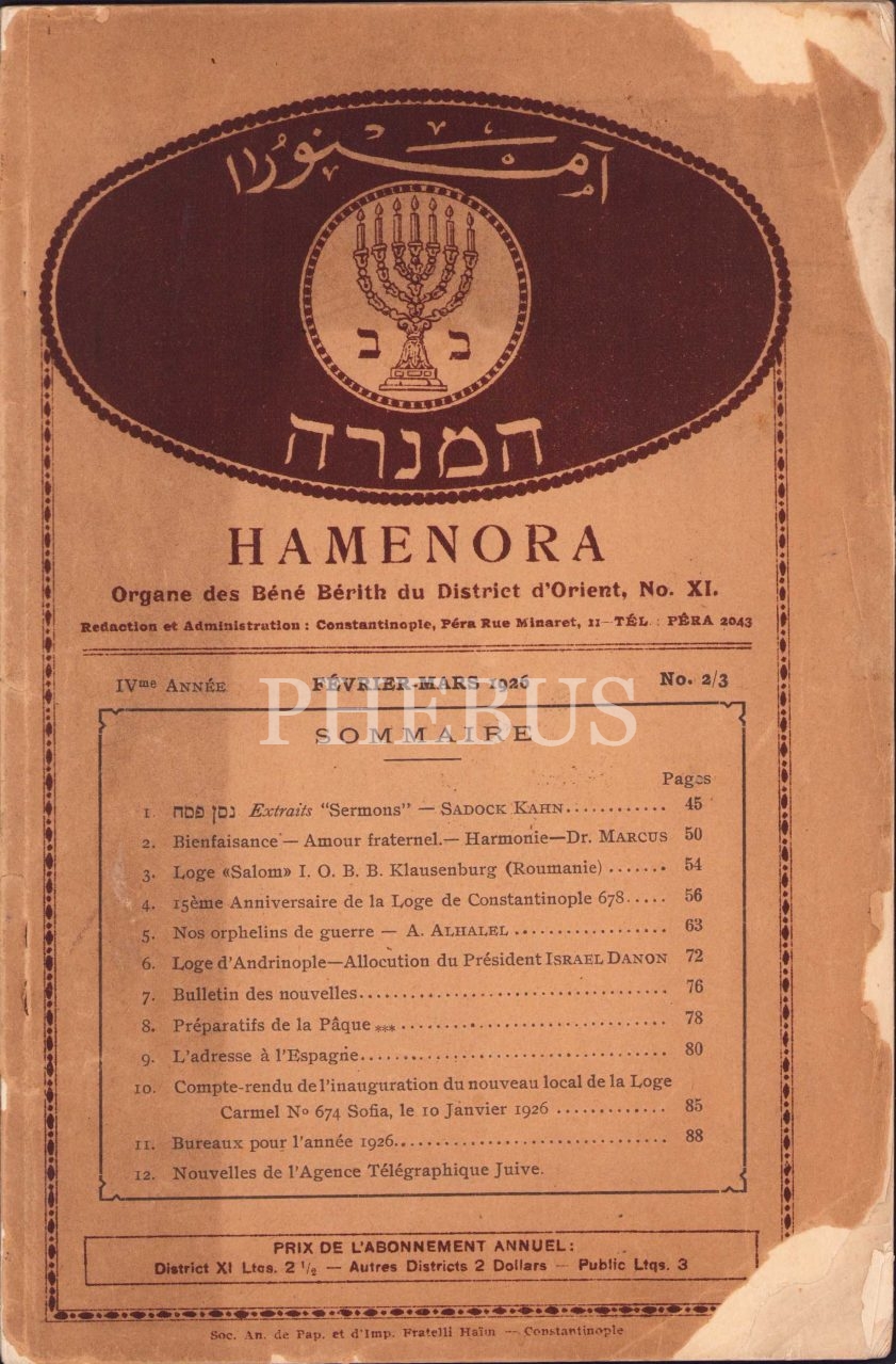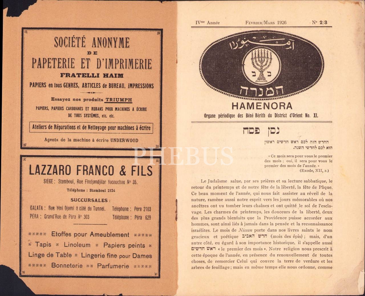 Fransızca ve İbranice Hamenora Mecmuası, Fratelli Haim Matbaası, Şubat-Mart 1926 tarihli, 92 sayfa, kapak haliyle, 16x24 cm