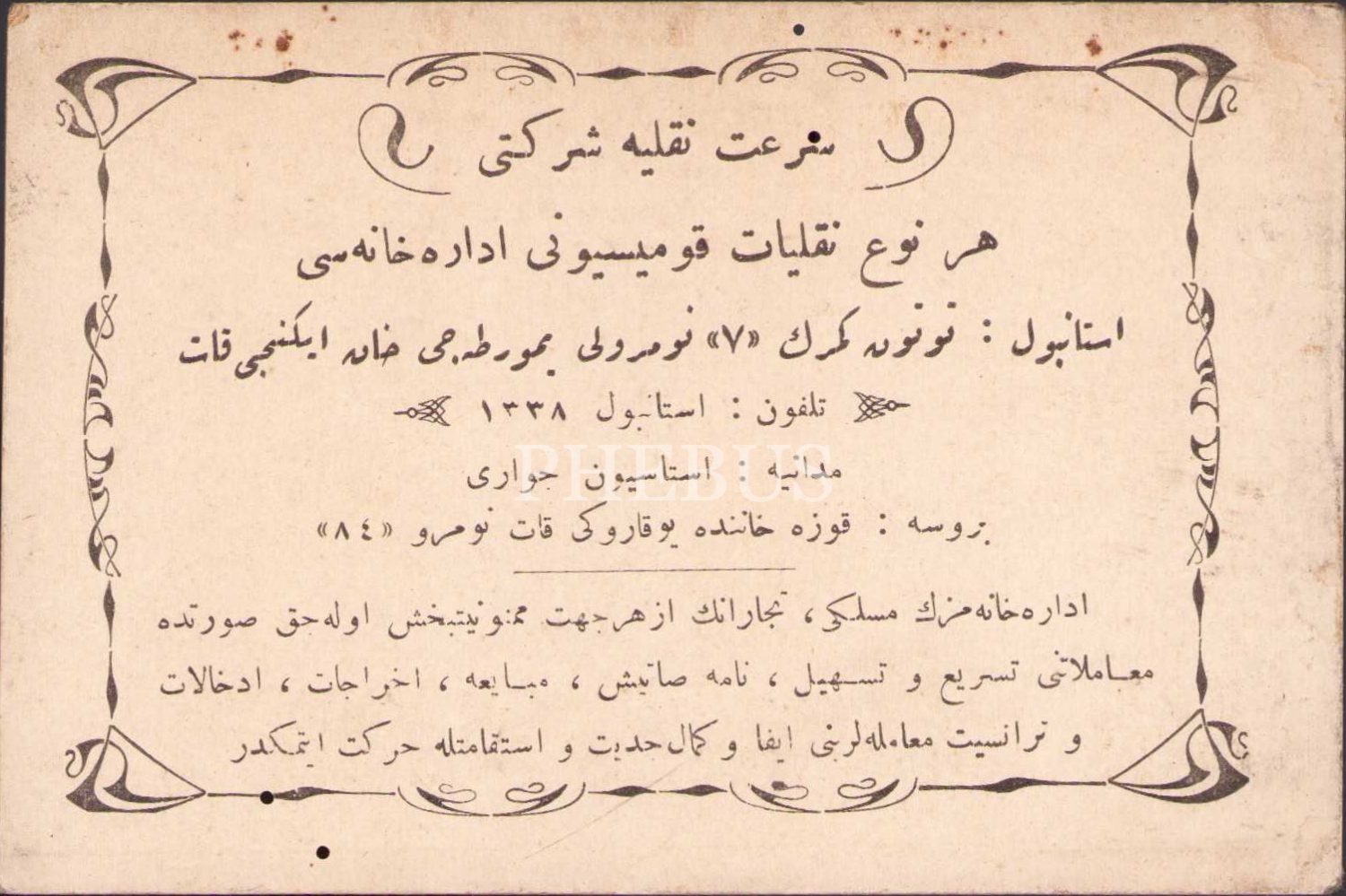 Osmanlıca Sürat Nakliye Şirketi Her Nevi Nakliye Komisyonu İdarehanesi reklam kartı, 13x9 cm