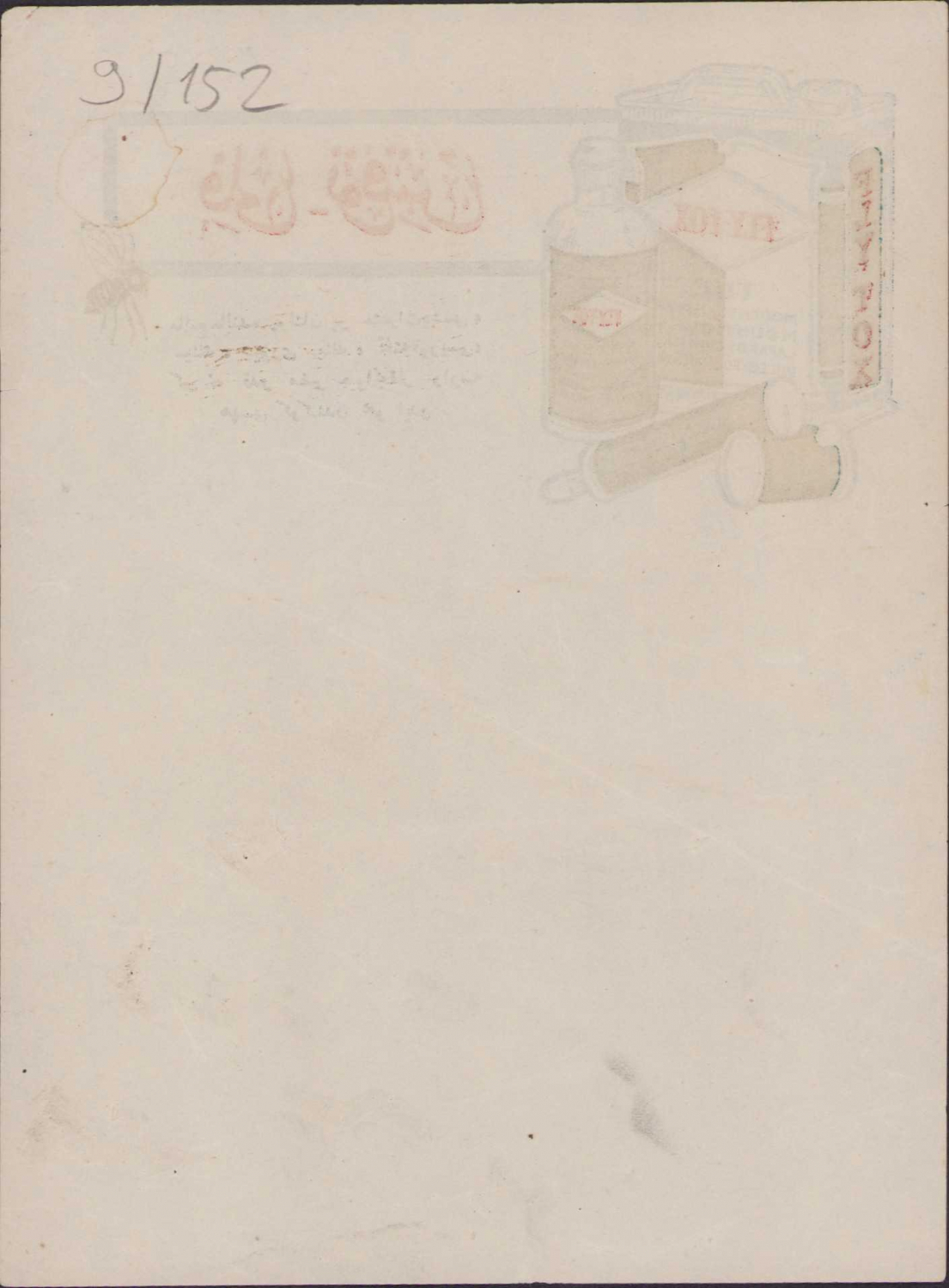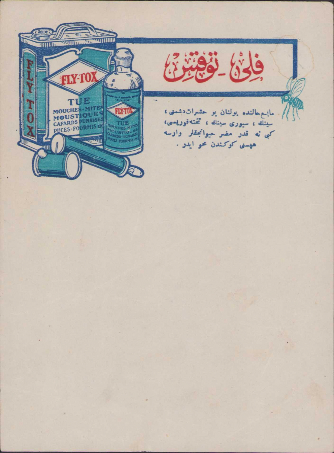 Osmanlıca Fly - Tox antetli boş iş yeri dokümanı, tanıtım yazısında; " Mayi (sıvı) halde bukunan bu haşerat düşmanı, sinek, sivri sinek, tahta kurus, gibi ne kadar muzur hayvancıklar var ise hepsini kökünden mahveder", Fransızca görselli, 12x16cm