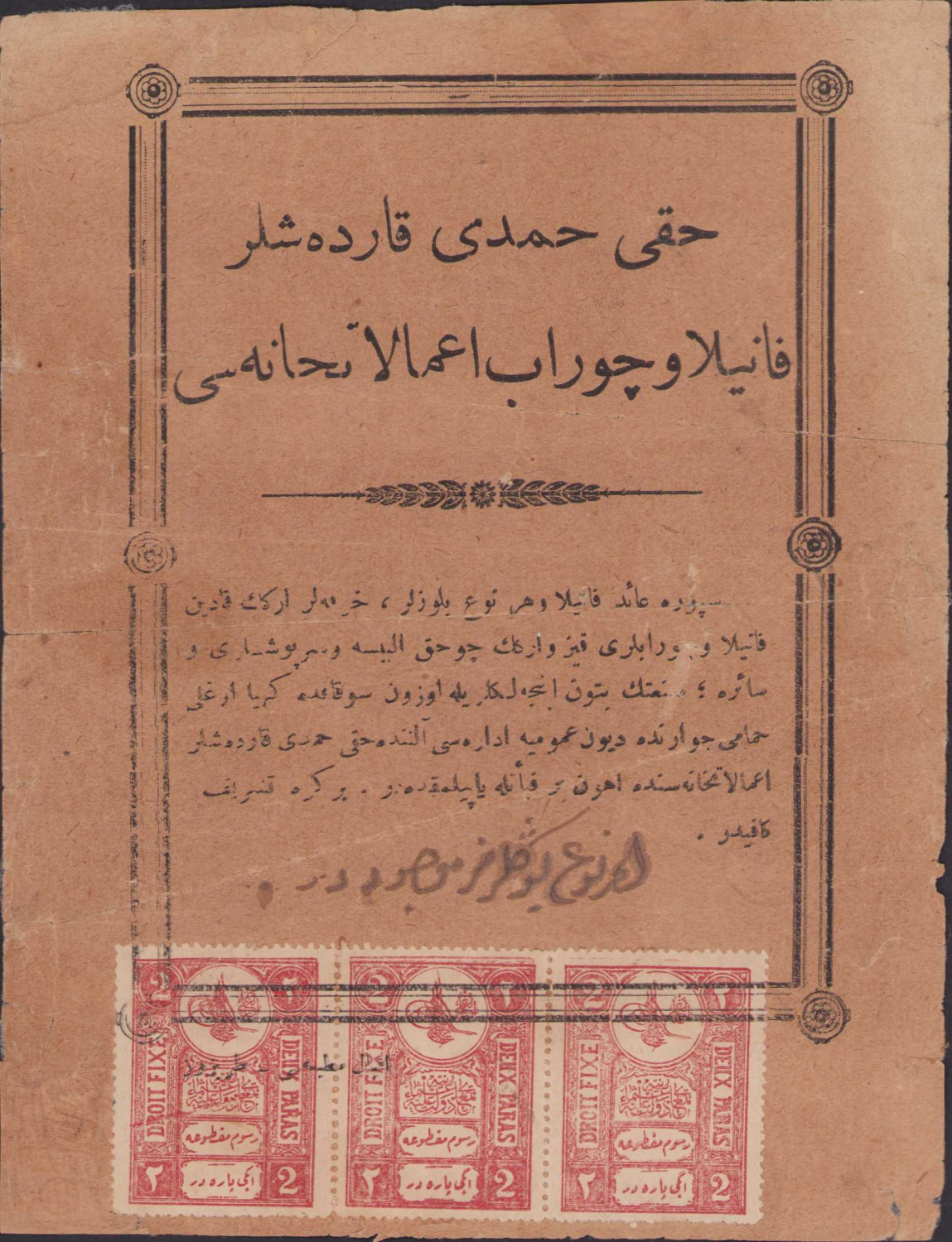 Osmanlıca Hakkı Hamdi Kardeşler Fanila ve Çorap İmalathanesi el ilanı, pullu, 14x18cm