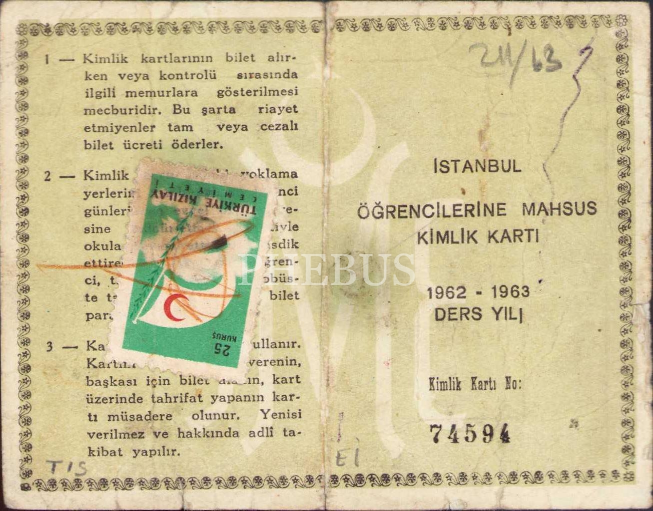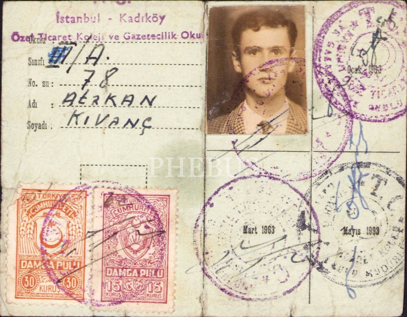 İstanbul Kadıköy Özel Ticaret Koleji ve Gazetecilik Okulu kimlik kartı, 1962 - 1963 ders yılı, haliyle, 10x7 cm