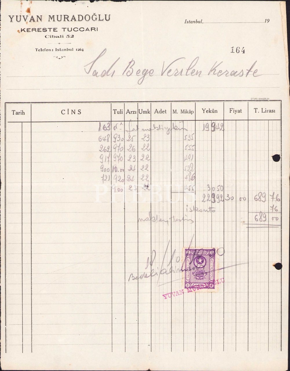 Yuvan Muradoğlu Kereste Tüccarı antetli fatura, 22x28 cm
