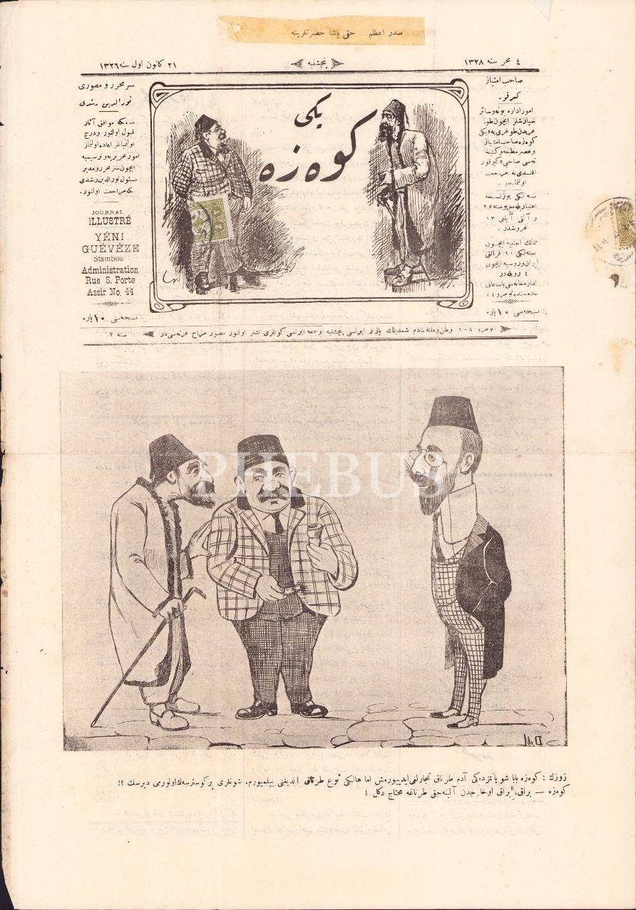 Osmanlıca Yeni Geveze Gazetesi, 21 Kanunuevvel 1326, "Sadrazam Hakkı Paşa Hazretlerine etiketli", 4 sayfa, 28x40 cm