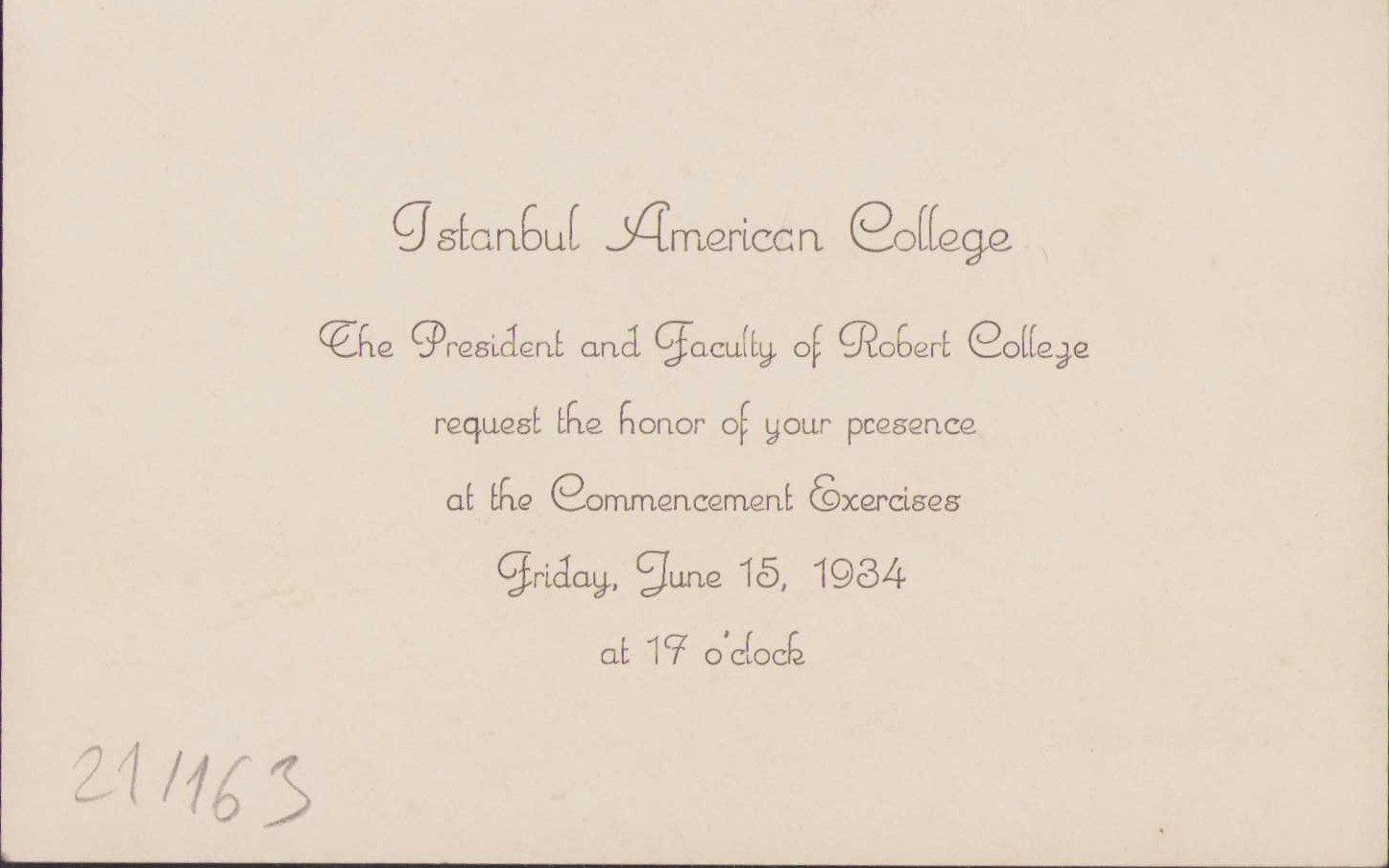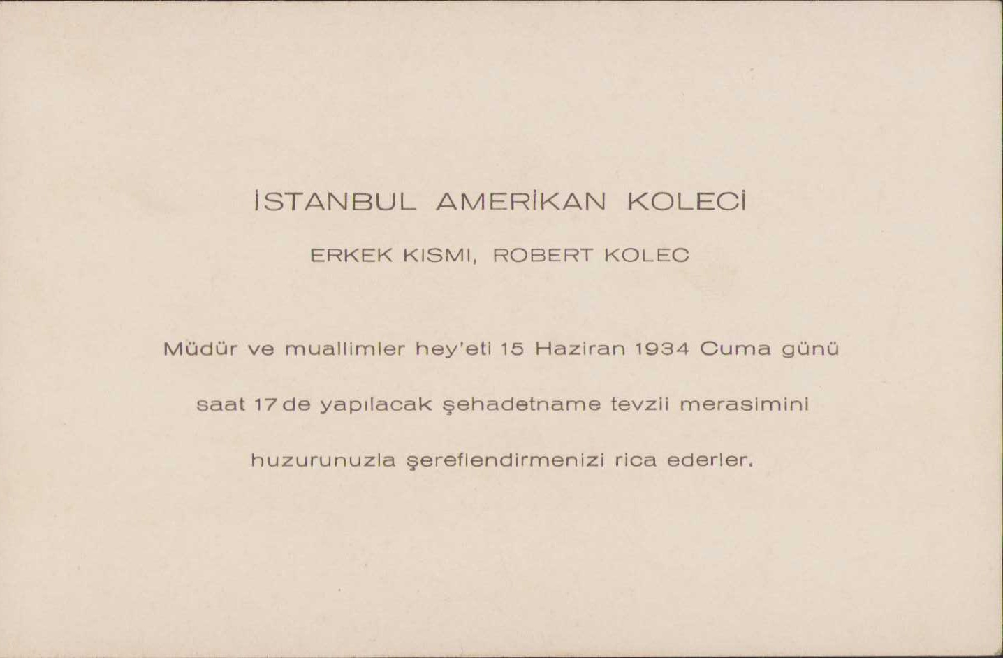 İstanbul Amerikan Koleji, Erkek Kısmı-Robert Koleji şehadetname tevzi töreni davetiyesi, İngilizce-Türkçe, 1934 tarihli, 12x8 cm
