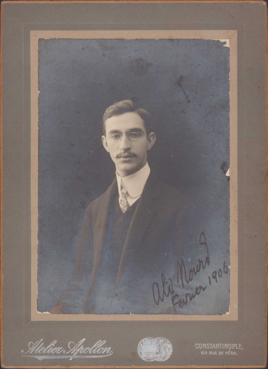 Osmanlı dönemi beyefendi portresi, stüdyo çekim, kabin fotoğrafı, 1906 tarihli, Foto Atelier Apollon, arkası Osmanlıca ithaf yazılı, 13,5x18,5cm