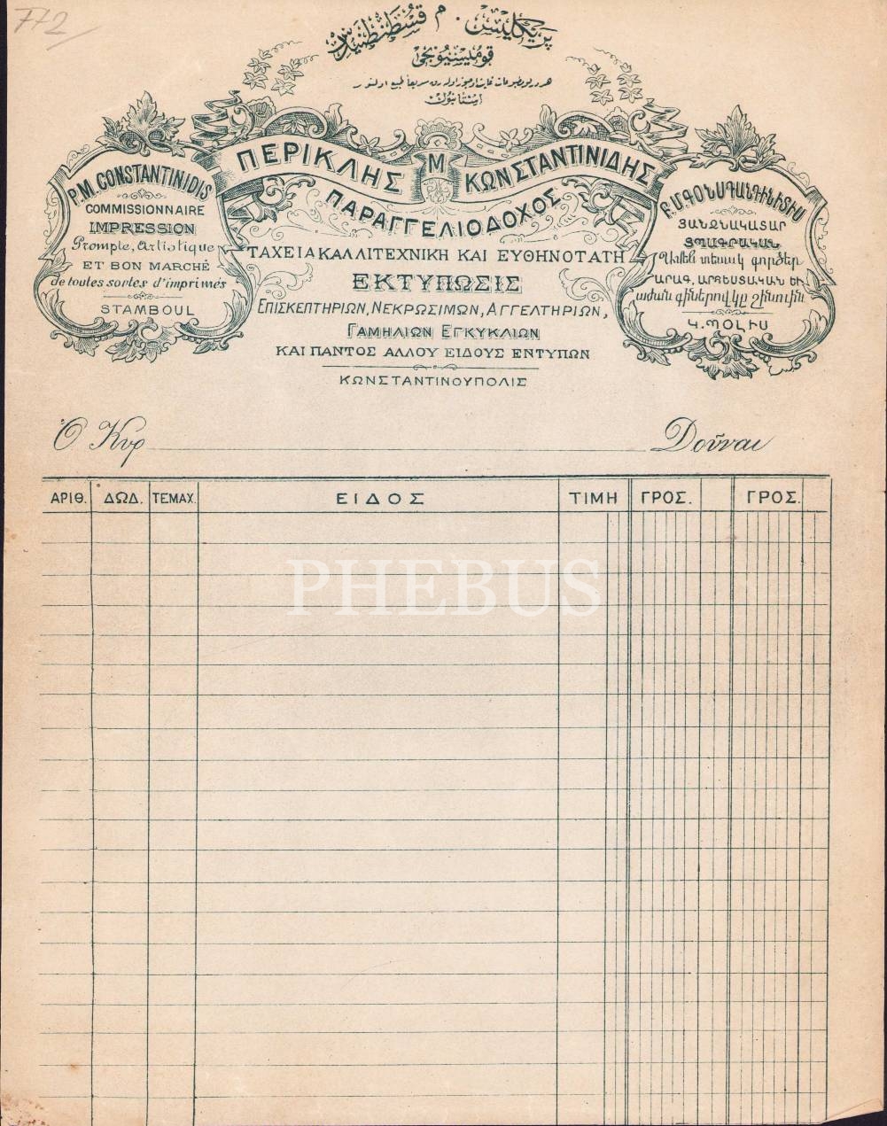 Osmanlıca, Ermenice, Rumca, Fransızca 4 dilde Rum Periklis M. Konstantinidis antetli işyeri faturası