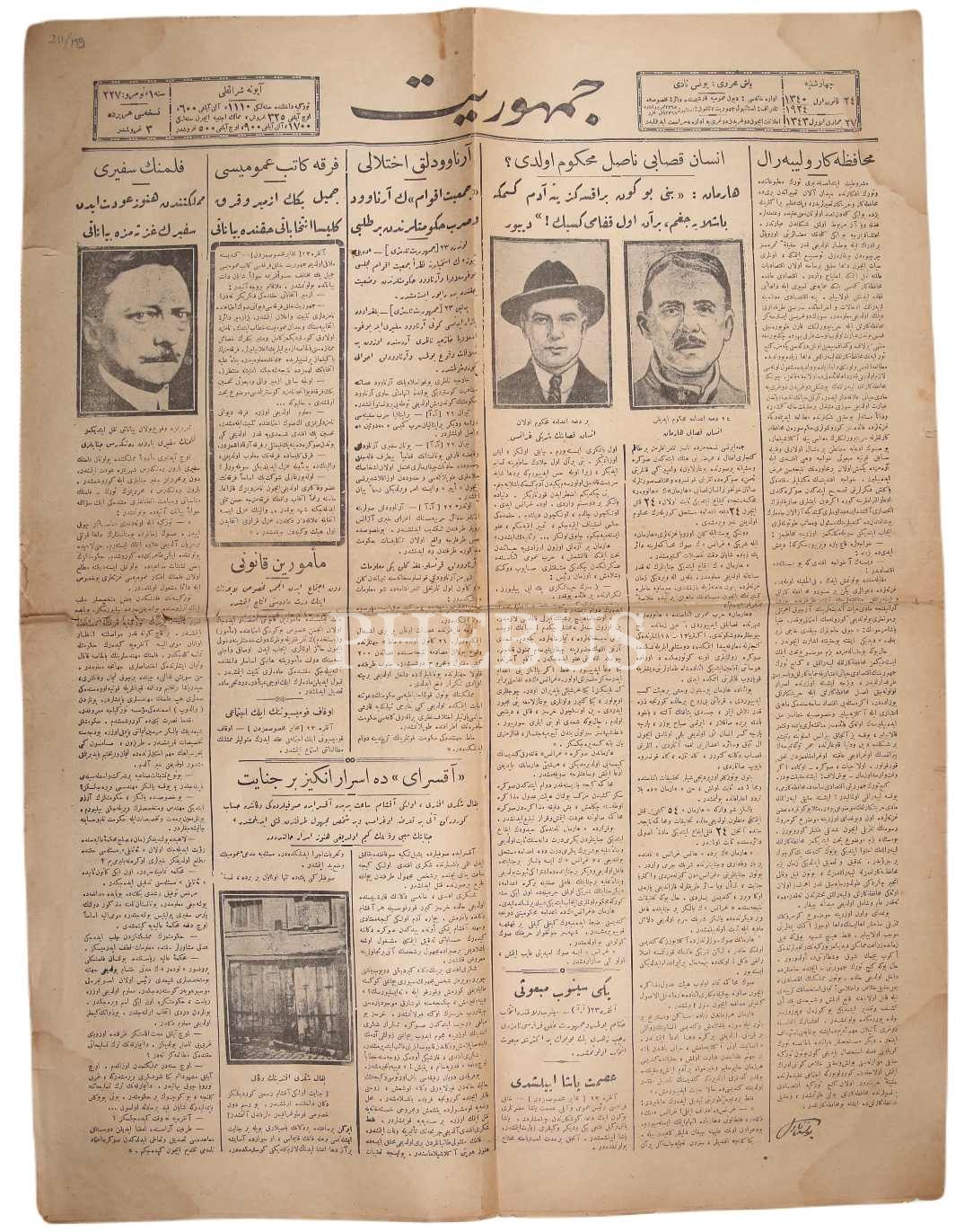 Osmanlıca Cumhuriyet gazetesi, 24 Kanunuevvel 1340, "İnsan Kasabı Nasıl Mahkum Oldu", "Arnavutluk İhtilali", kenarlarında yırtıklar mevcut, 6 sayfa, 40x60 cm