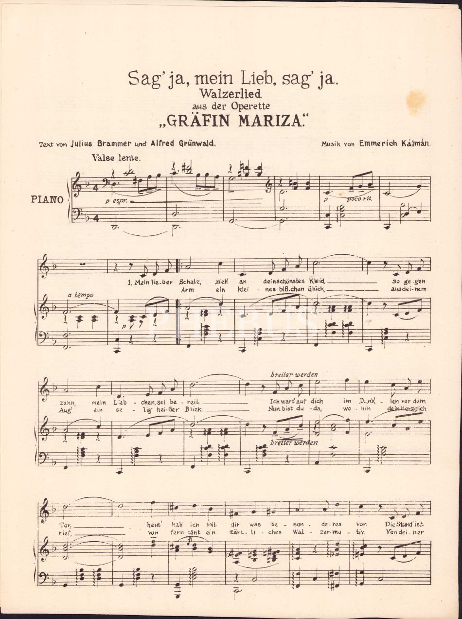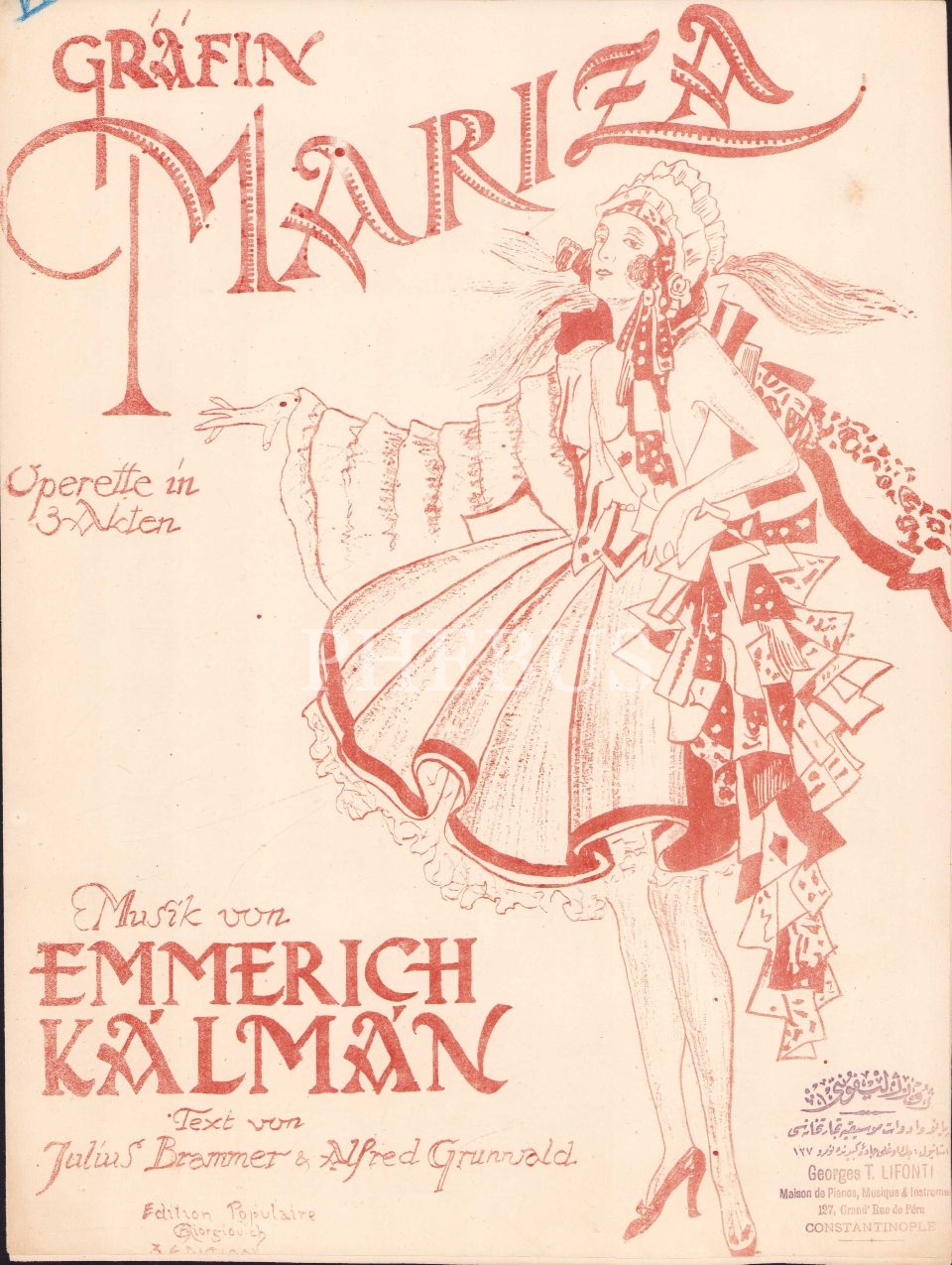 Osmanlıca Georges Lifonti Constantinople damgalı, Almanca nota, Grafin Mariza, Müzik Emmerich Kalman, 5 sayfa, 23x30 cm