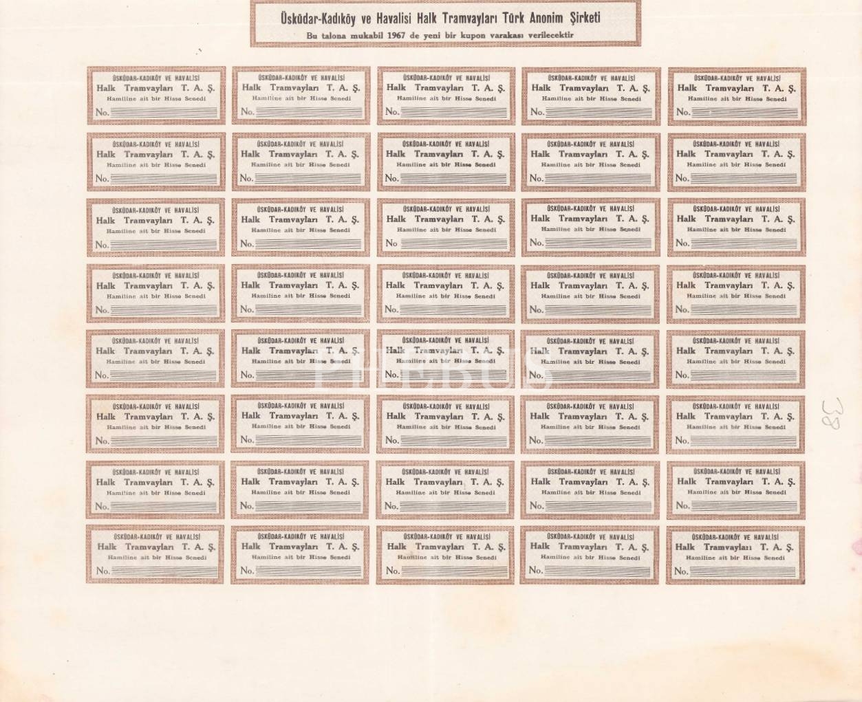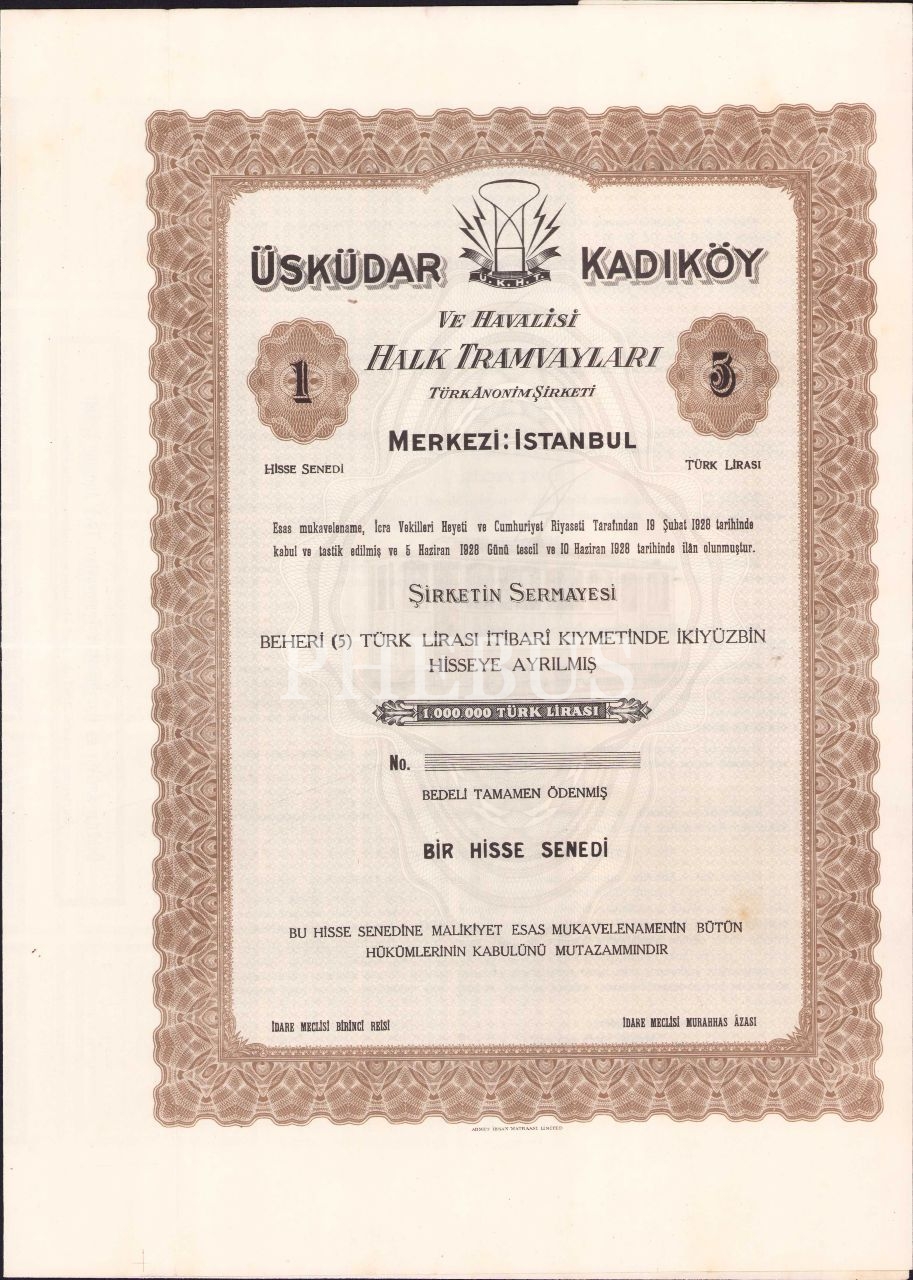 Üsküdar Kadıköy Ve Havalisi Halk Tramvay Türk Anonim Şirketi hisse senedi, 63x36 cm