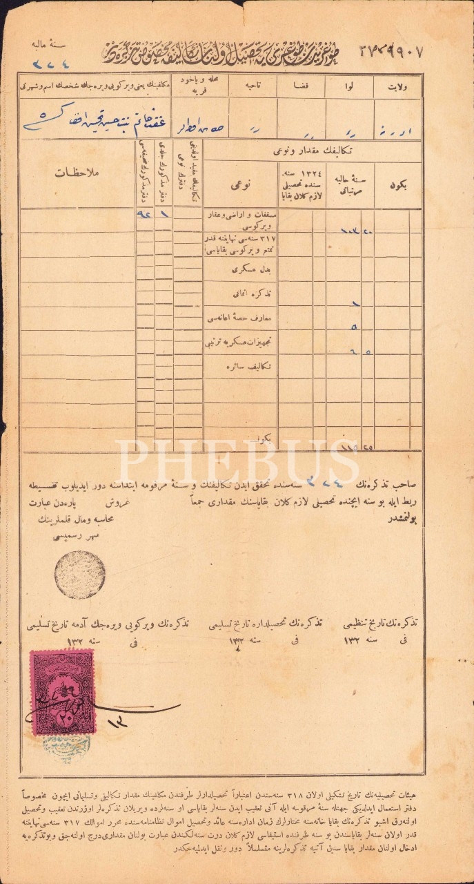 Osmanlıca 1326 senesi doğrudan doğruya tahsil edilen vergilere mahsus tezkire, Edirne, 16x32 cm