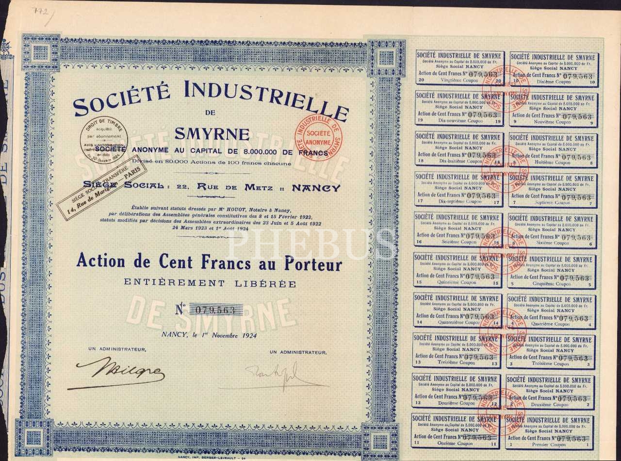 Fransızca hisse senedi, Societe İndustrielle de Smyrne Societe Anonyme Au Capital, 40x31 cm