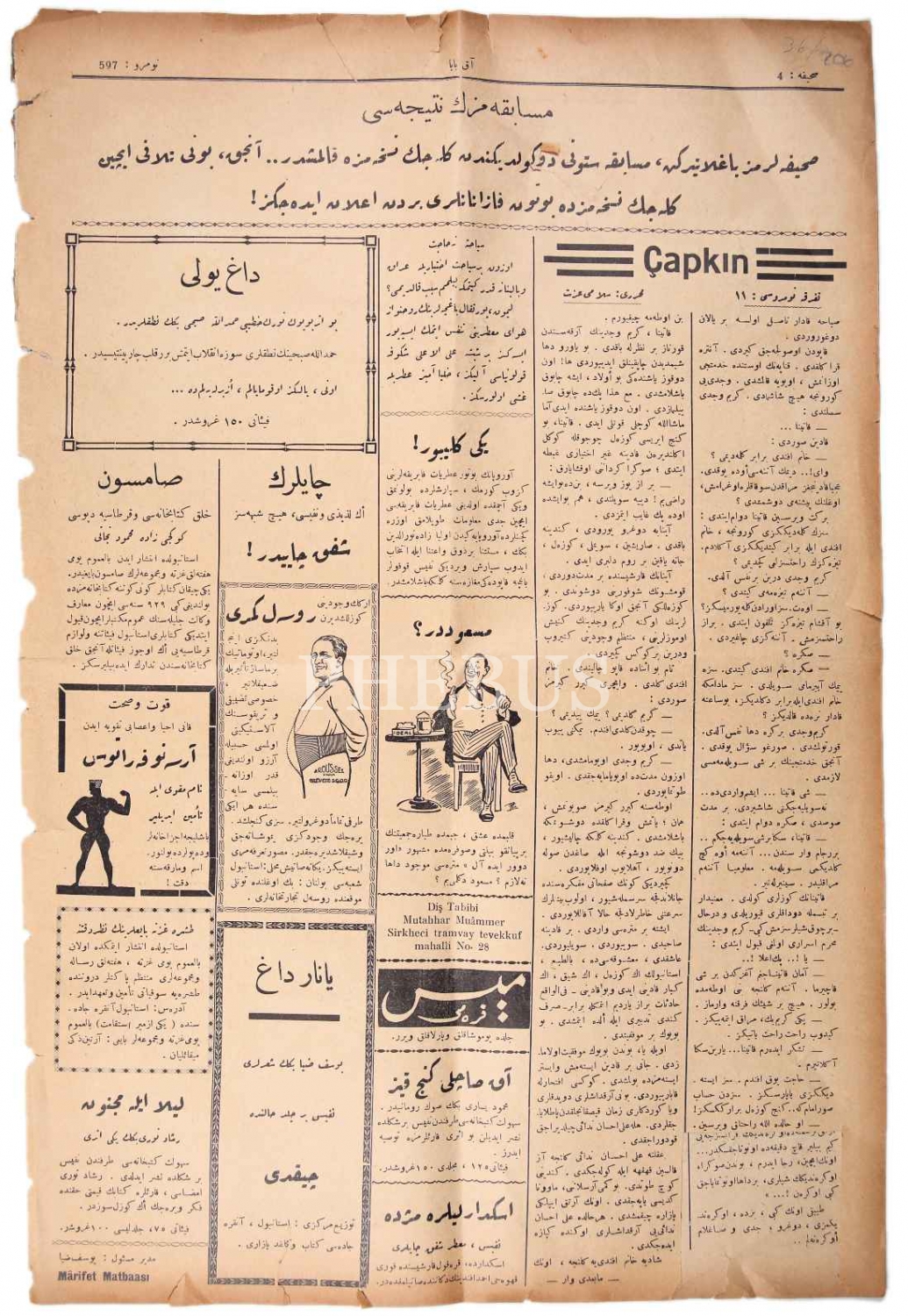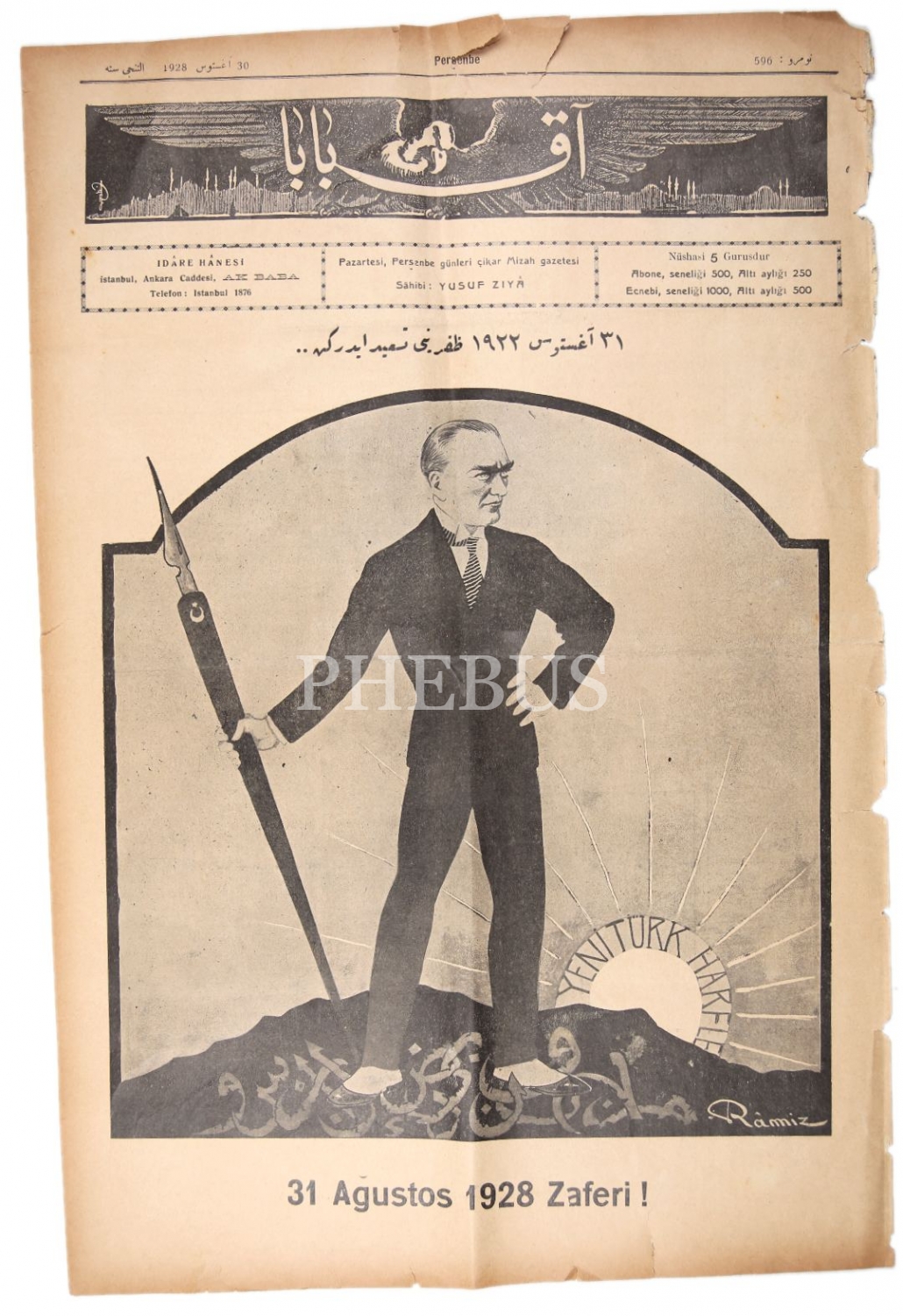 Atatürk kapaklı, Yeni Türk Harfleri - 31 Ağustos 1922 Teyit Ederken [31 Ağustos 1928 Zaferi] manşetli Harf İnkılabından yaklaşık bir ay önce çıkan iki dilde Osmanlıca Akbaba mizah gazetesi, sahibi Yusuf Ziya, 30 Ağustos 1928, haliyle, 4 sayfa, 30x46 cm