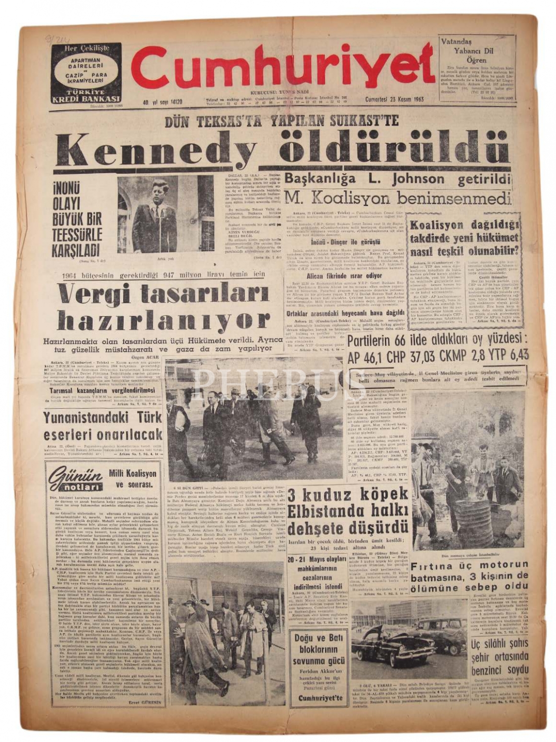 Dün Teksas'ta Yapılan Suikastte Kennedy Öldürüldü manşetli Cumhuriyet gazetesi, 23 Kasım 1963, haliyle, 8 sayfa, 40x60 cm