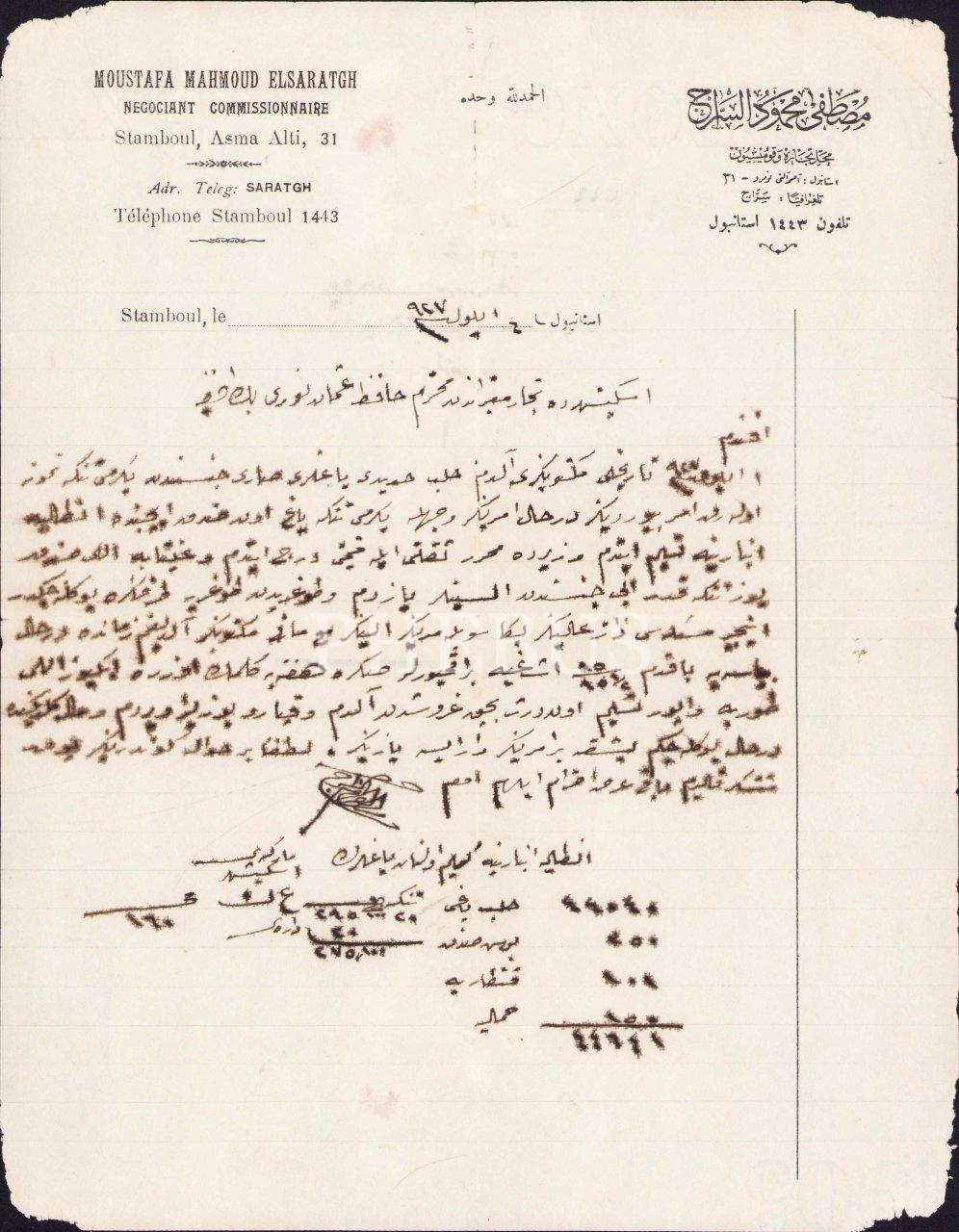 Osmanlıca - Fransızca Mustafa Mahmud Elsarac Ticaret ve Mensucat İstanbul antetli 1928 tarihli evrak, 22x27 cm