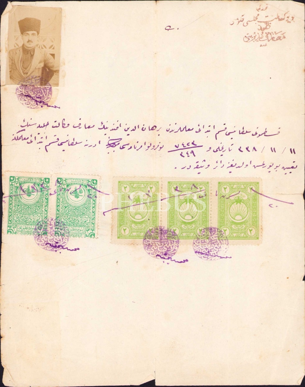 Kastamonu Sultanisi İbtidai muallimlerinden Burhaneddin Efendi'nin maarif vekaleti celilesinin 11. 11. 1338 tarihindeki kararıyla Edirne Sultanisi kısmı ibtidai muallimliğine tayin edildiğine dair Osmanlıca evrak, 16x20 cm