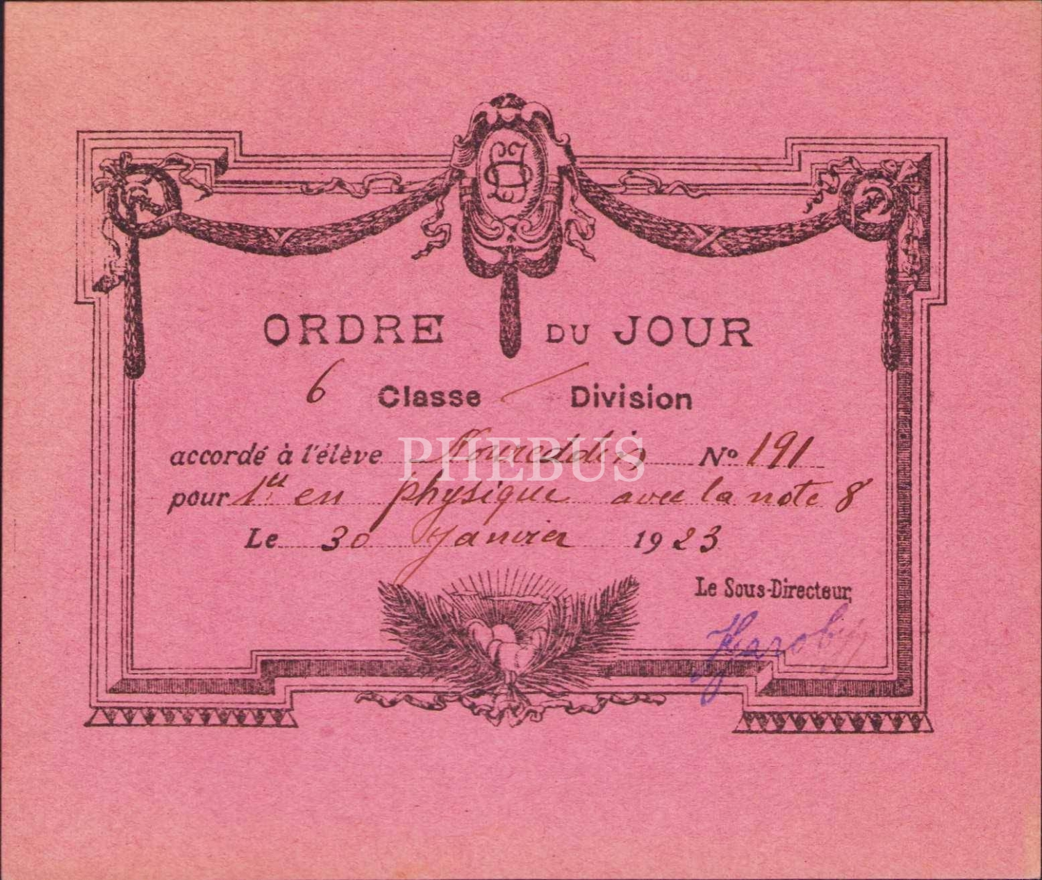 Fransızca aferin, Saint Joseph Lisesi, 1923 tarihli, 12x10 cm