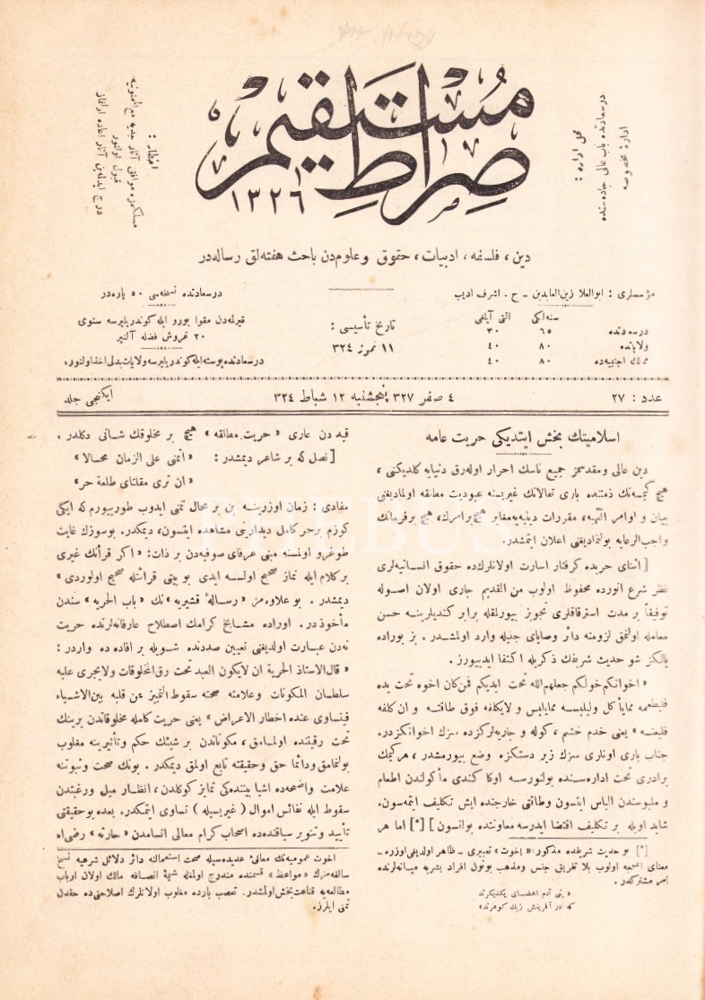 Osmanlıca Sırat-ı Müstakim - din, felsefe, edebiyat ve hukuktan bahseden haftalık risale, İkinci cilt, 27 - 51 sayıları arası, 1324 - 25 yılları, 415 sayfa, 23x33 cm