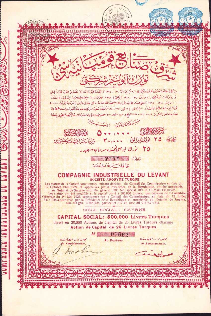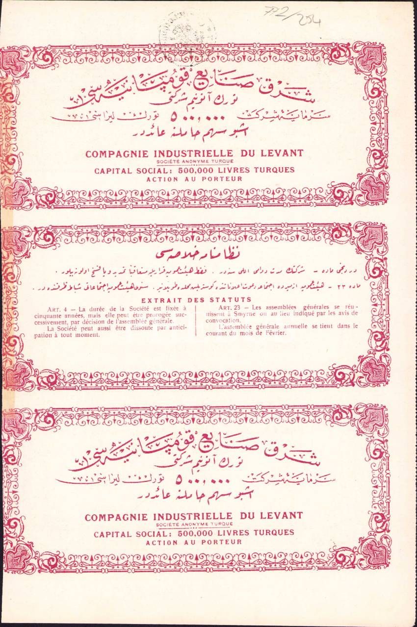 Osmanlıca - Fransızca Şark Sanayi Kumpanyası Türk Anonim Şirketi hisse senedi, 20x29 cm
