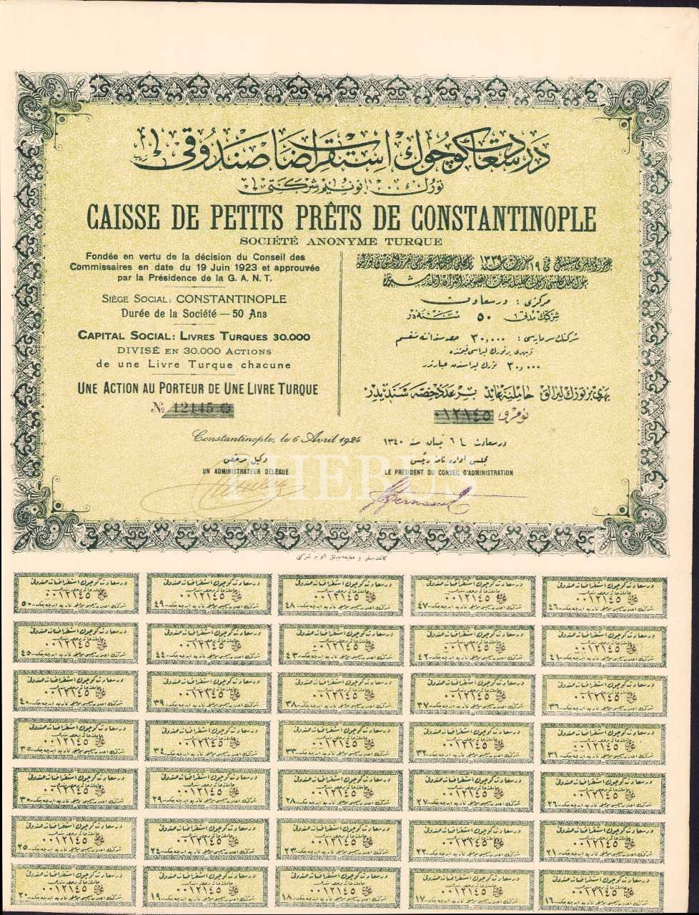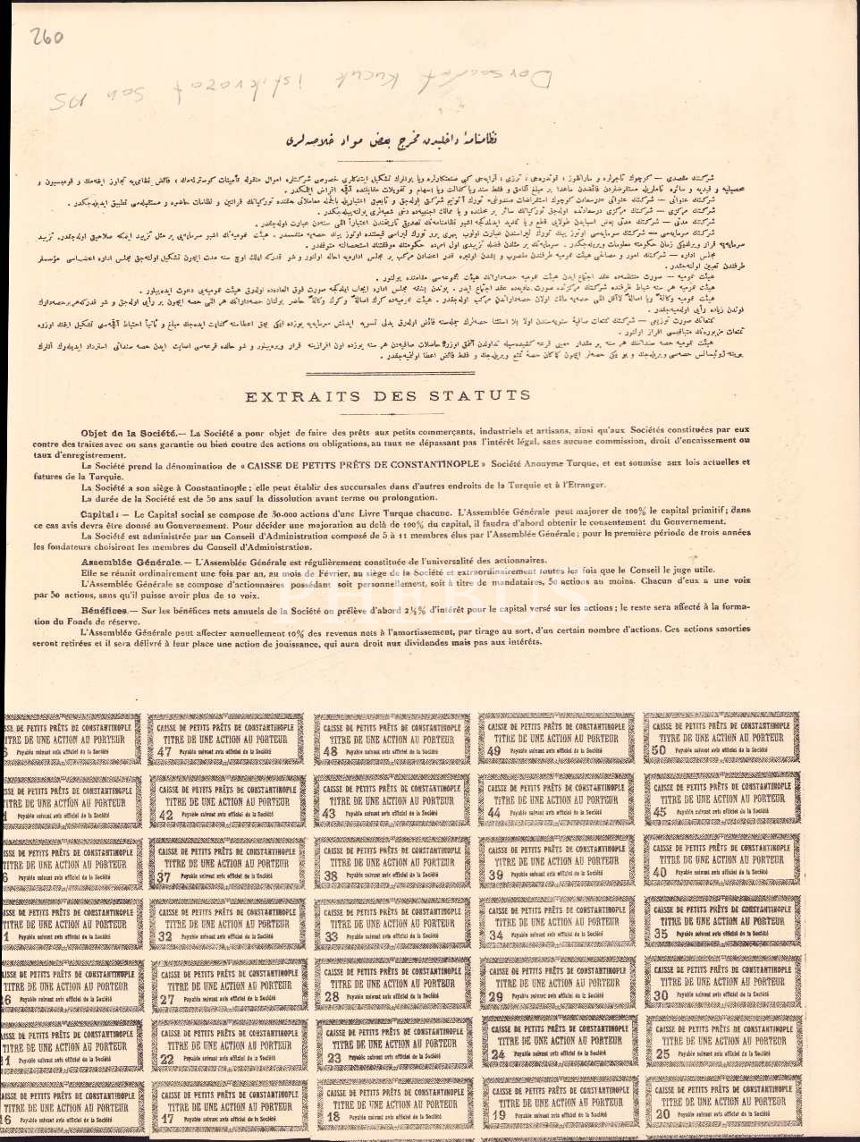 Osmanlıca - Fransızca İstanbul (Dersaadet) Küçük İstikrazat Sandığı Türk Anonim Şirketi hisse senedi, 31x39 cm