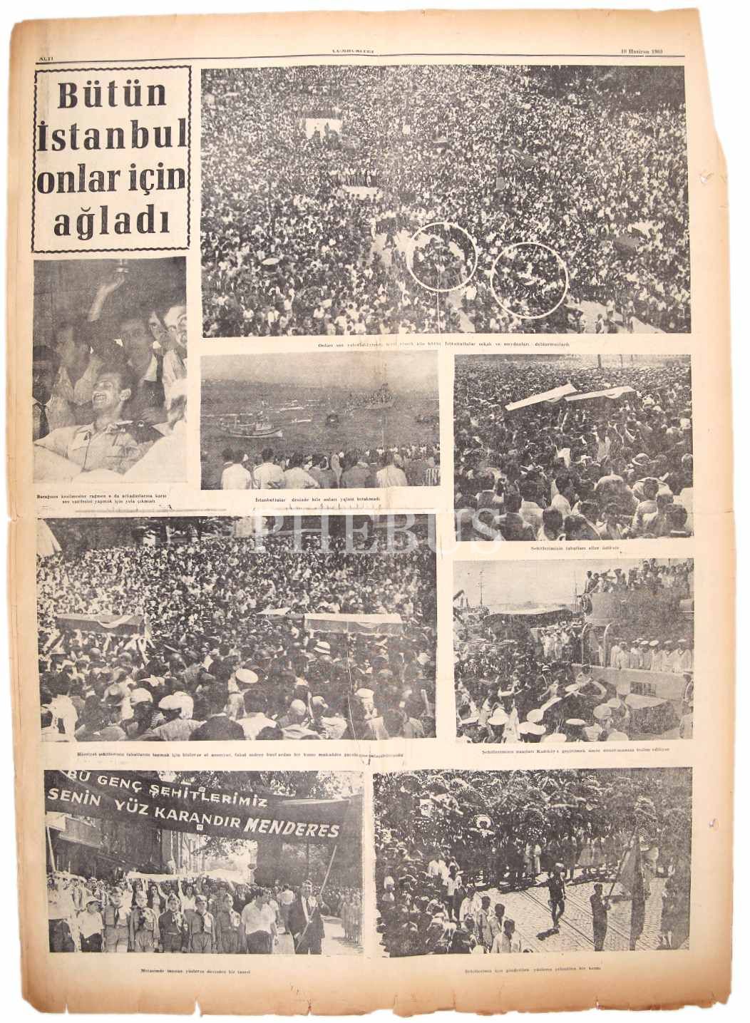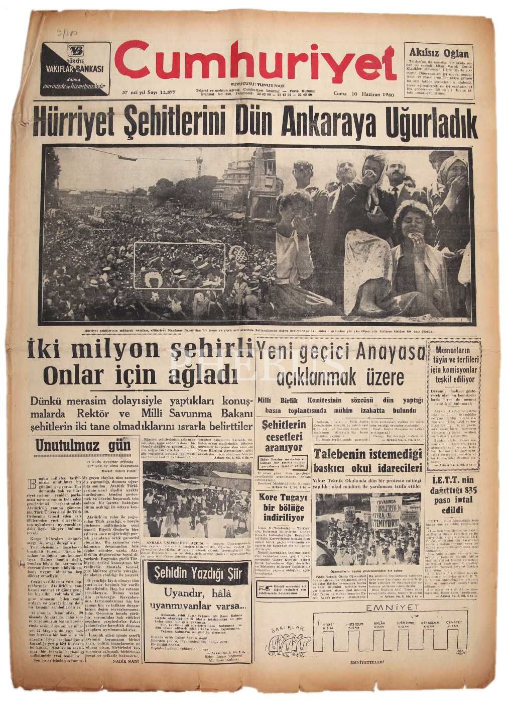 Hürriyet Şehitlerini Dün Ankara'ya Uğurladık manşetli, Cumhuriyet gazetesi, 10 Haziran 1960, 6 sayfa, 40x60 cm