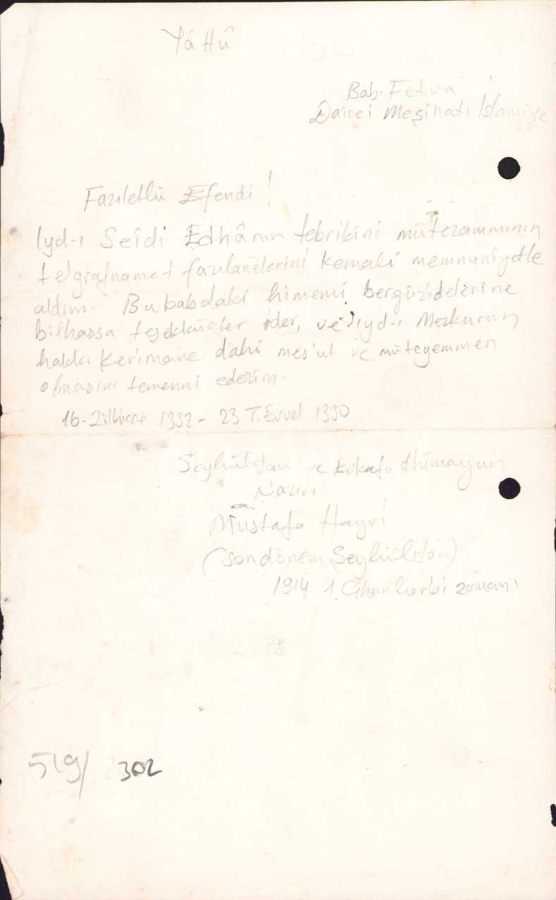 Bab-ı Fetva Dairei Meşihatı İslamiye antetli, i3 Kasım 1914 tarihli belge, eski başbakanlardan Suat Hayri Ürgüplü'nün babası Mustafa Hayri (Ürgüplü) Efendi, 13x22 cm