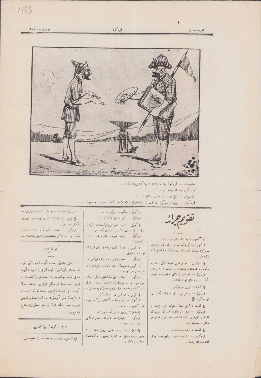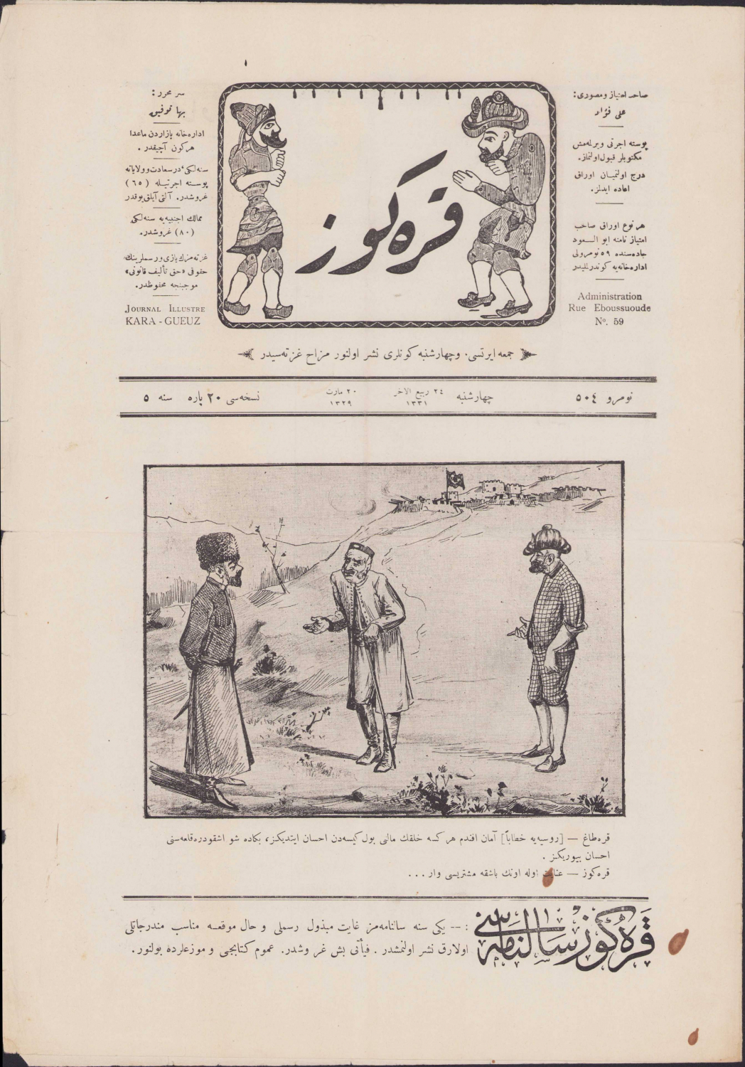Osmanlı Karagöz mizah gazetesi, 504. sayı, 1331 tarihli, kapakta Karagöz ve Karadağ arasında geçen mizahi diyalog yer almakta, 4 sayfa, 29x41cm