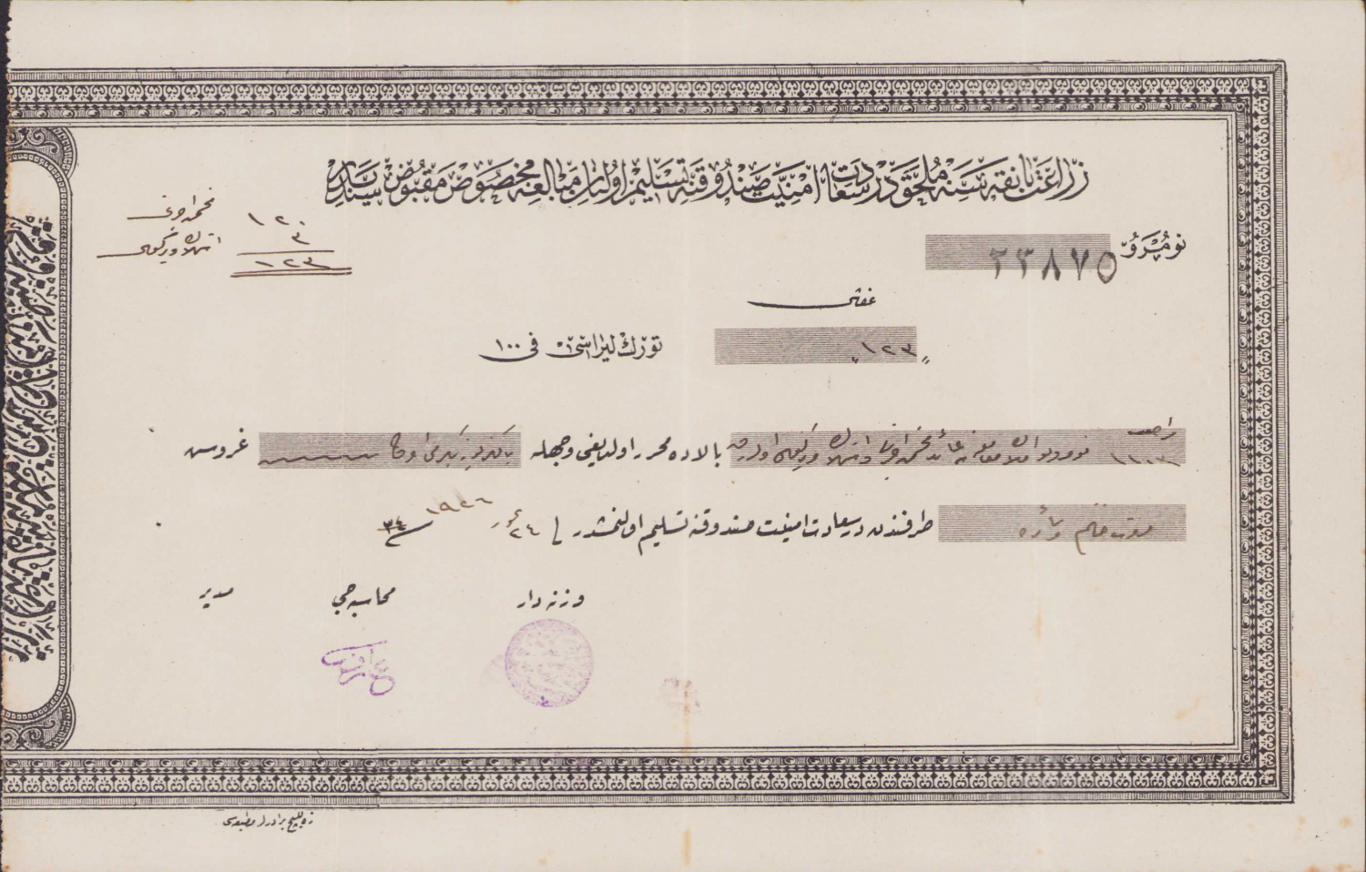 Ziraat Bankası Emniyet Sandığı makbuz senedi, Osmanlıca 1926 tarihli, damgalı, imzalı, 24x15