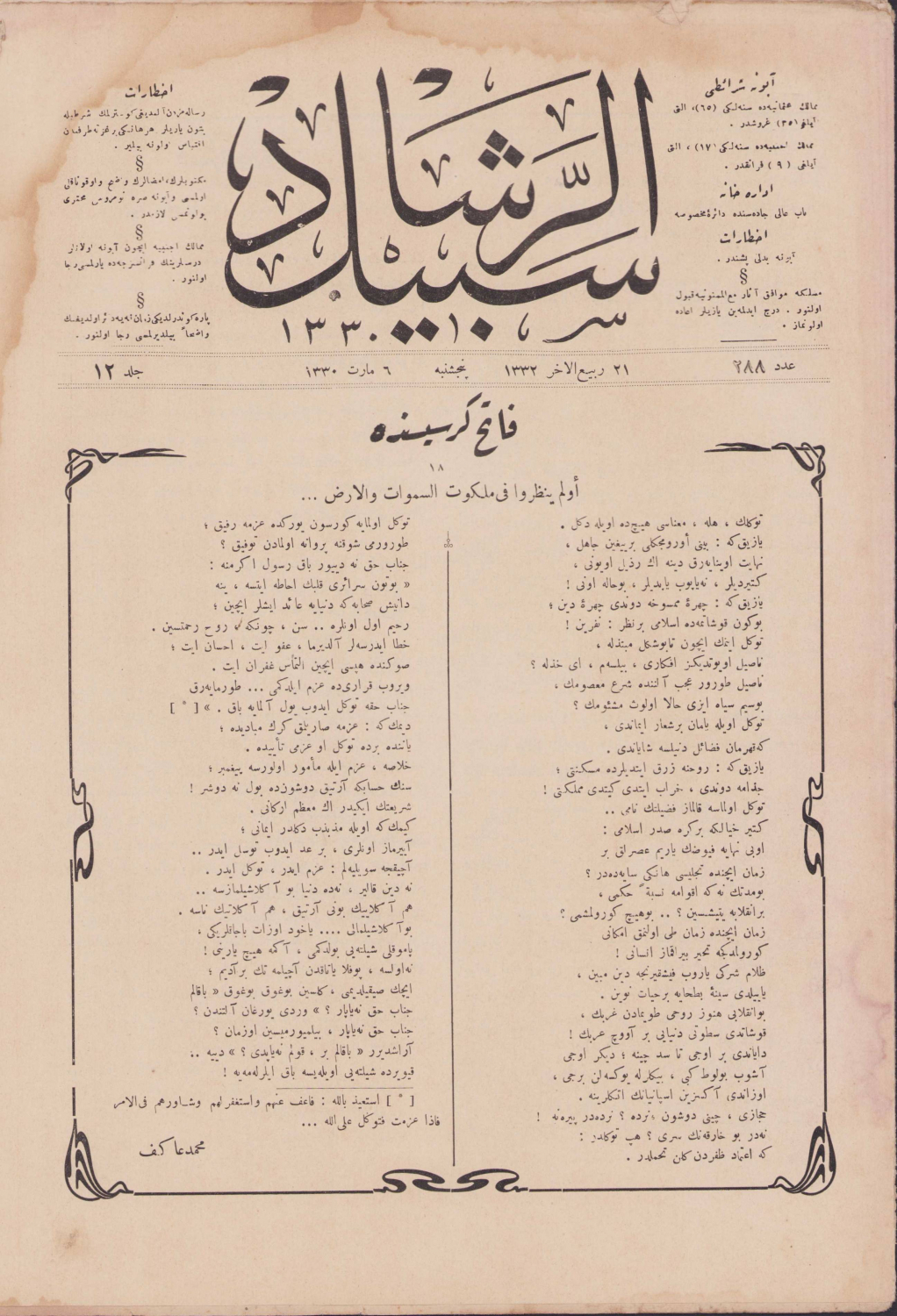 Sebilürreşad, 288.sayı, Sahibi ve yayıncısı Eşref Edip Fergan, Başyazarı Mehmed Akif Ersoy, Osmanlıca dergi, 1332, 40 sayfa, ilk sayfa Mehmed Akif'e ait Fatih Kürsüsünde şiiri, 25x35cm