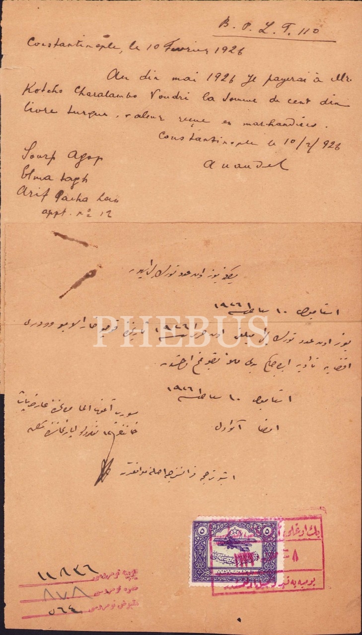 Sırp Agop Kilisesi Apartmanıkira makbuz senedi, 1926, Rumca Osmanlıca evrak, 16x28 cm