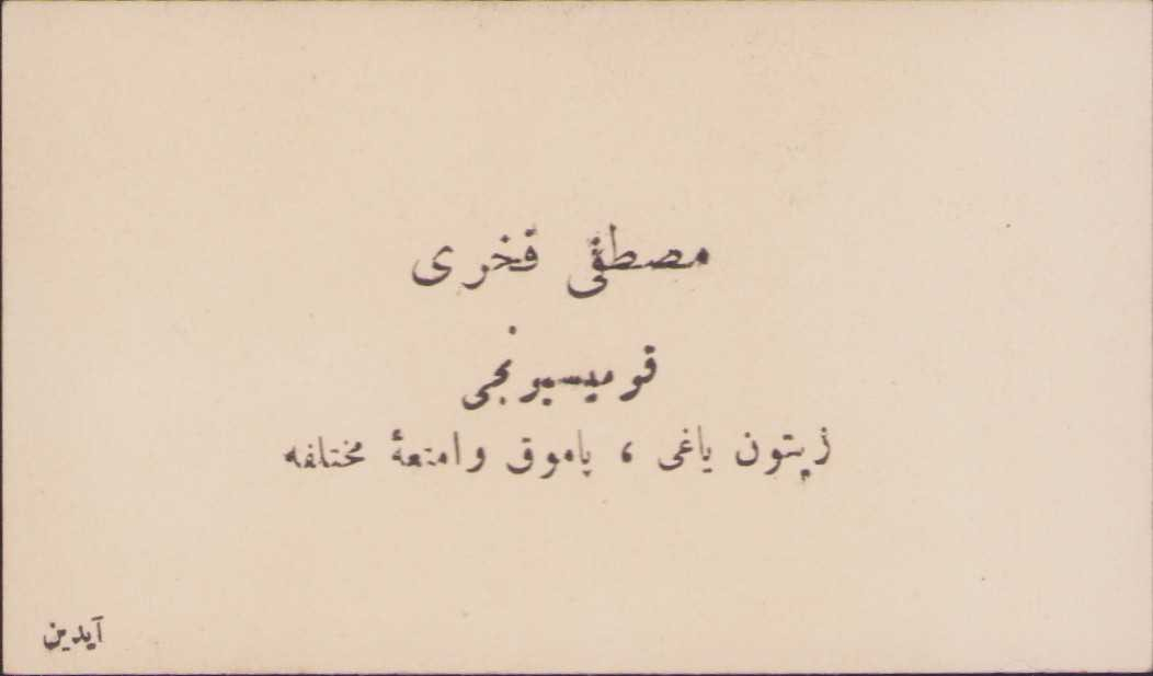 Osmanlı komisyoncu Mustafa Fahri'ye ait iş yeri kartı, Aydın, 9x5cm