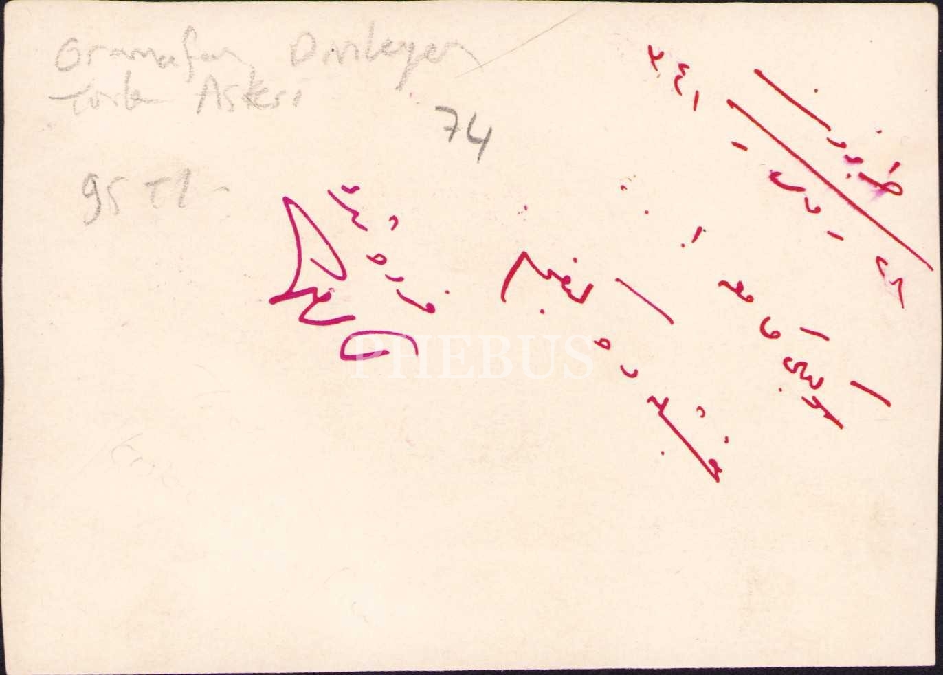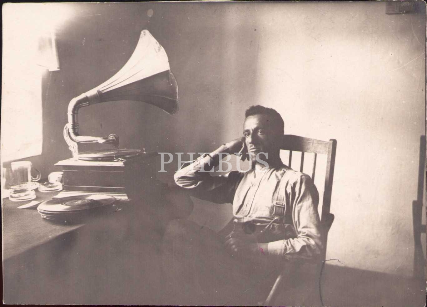 Gramafon dinleyen asker, arkası Osmanlıca yazılı, 1341 tarihli, 11x8 cm