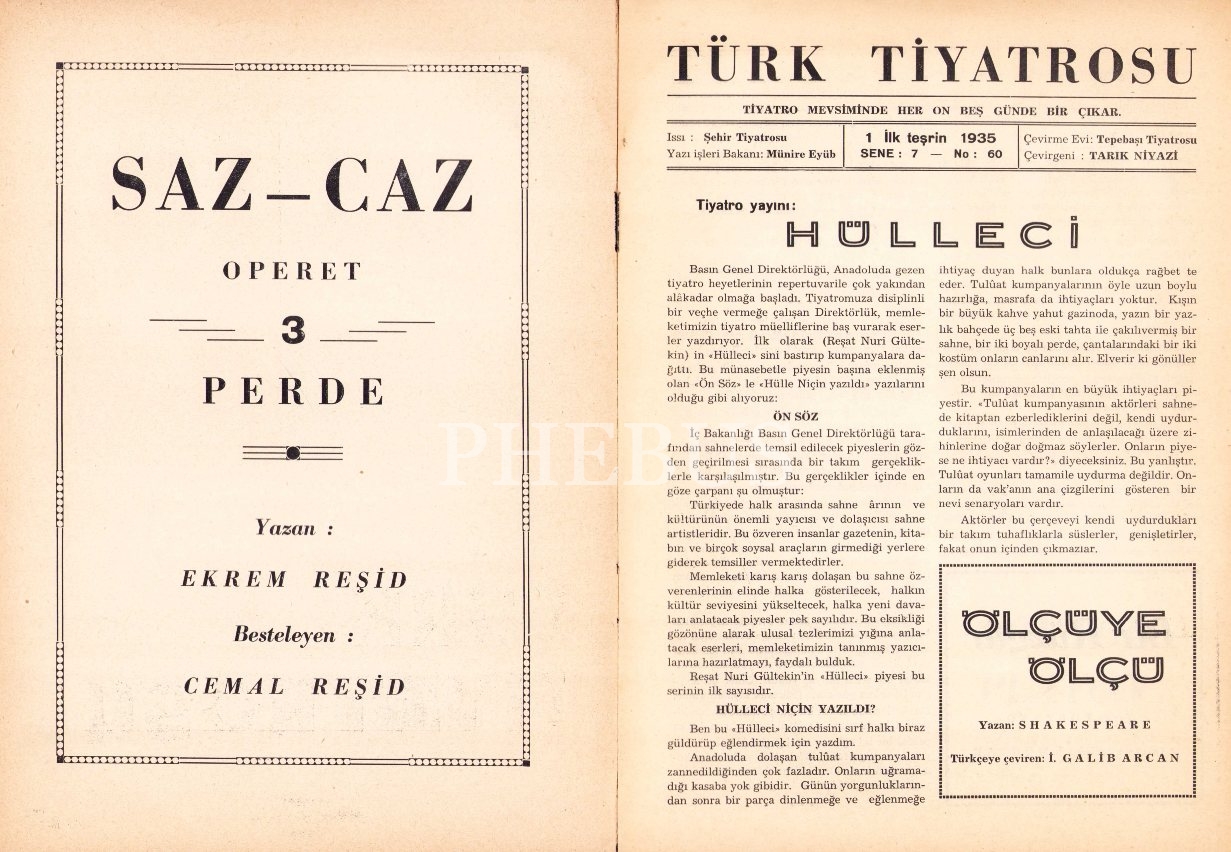 Türk Tiyatrosu Sayı: 60 - Sene: 7, İstanbul Akşam Matbaası 1935, 16 sayfa, arka kapakta küçük bir kopuk mevcut, 20x28 cm