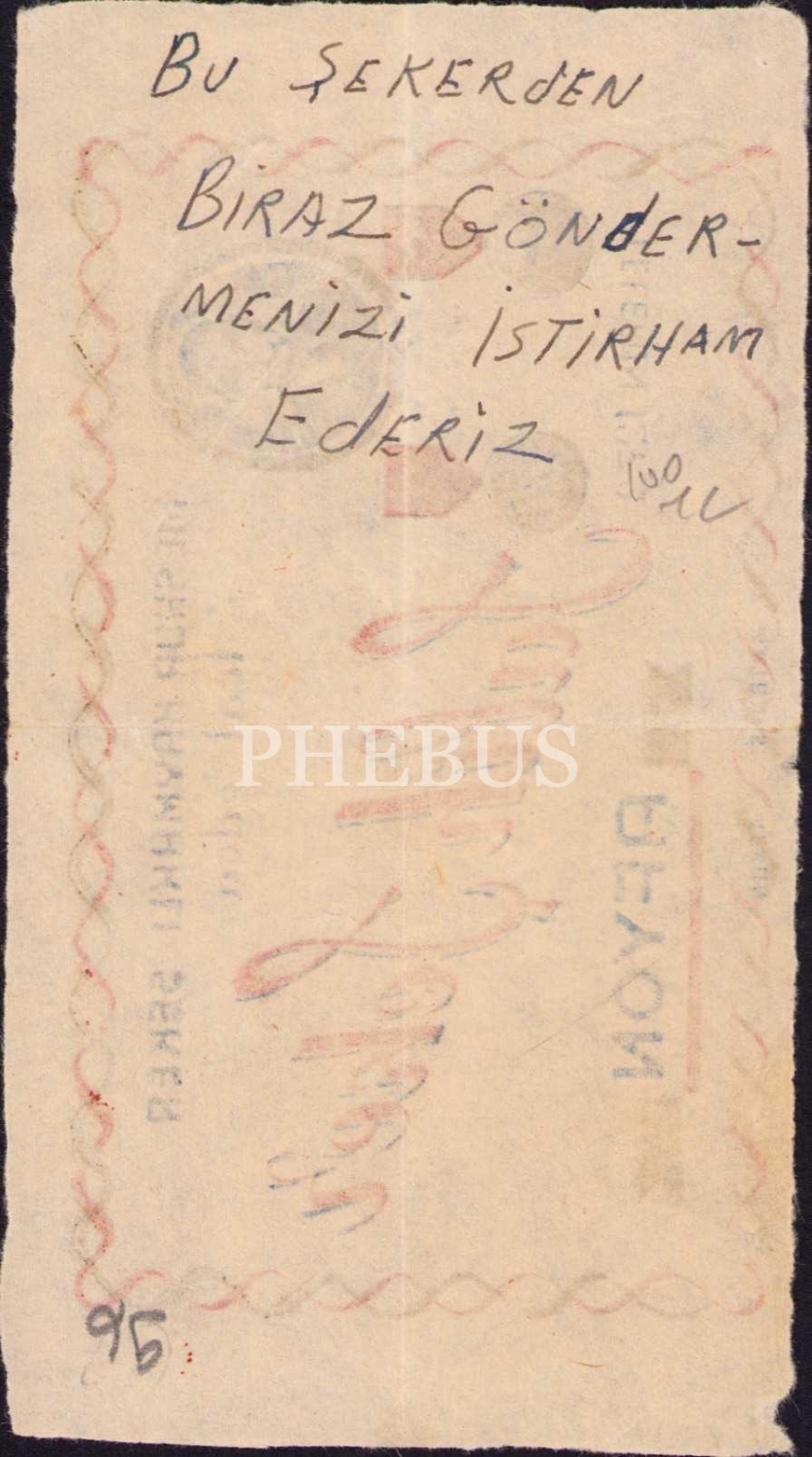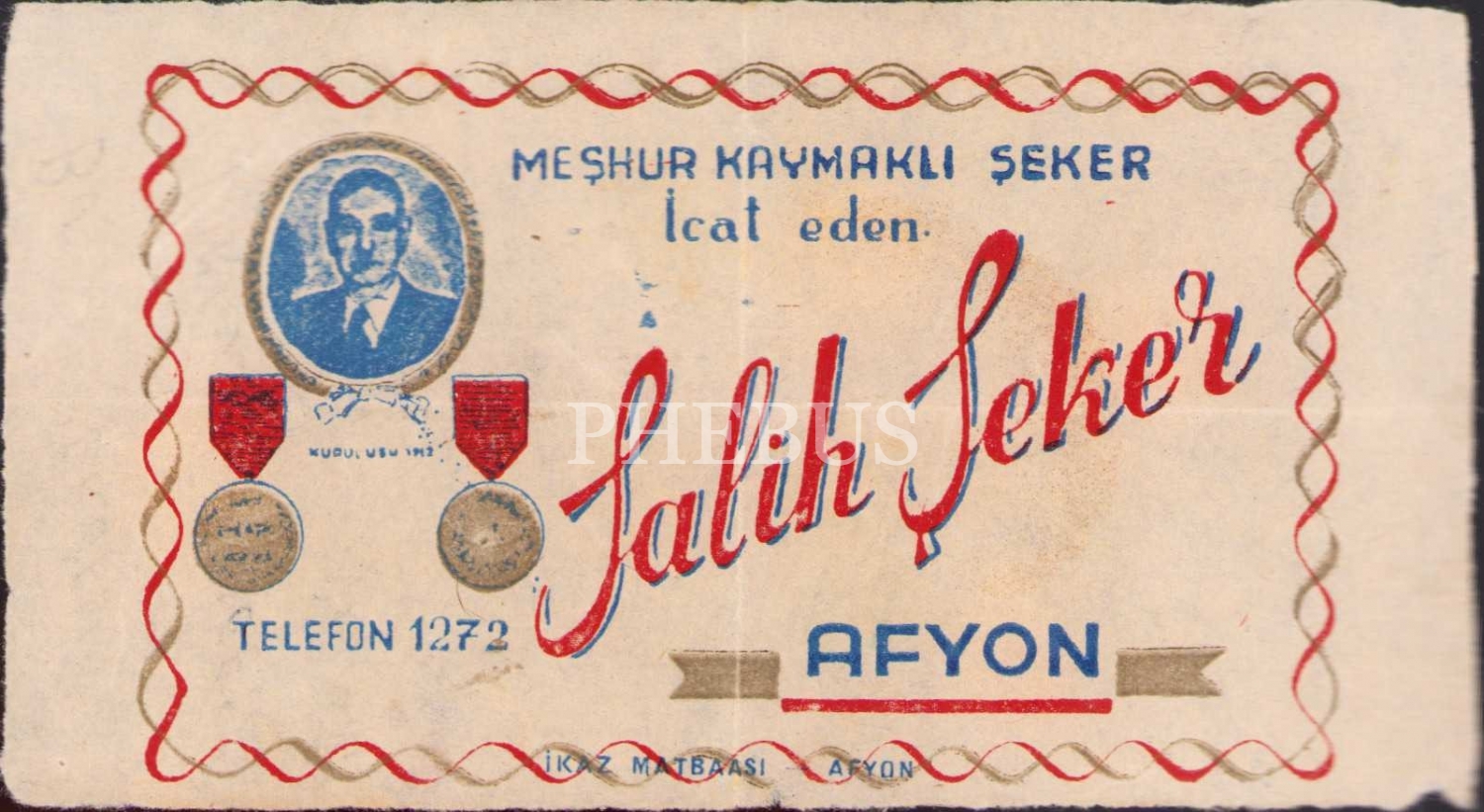 Meşhur Kaymaklı Şeker icat eden Fatih Şeker - Afyon reklam kağıdı, arkası ''Bu şekerden biraz göndermenizi istirham ederiz'' yazılı, 13x7 cm