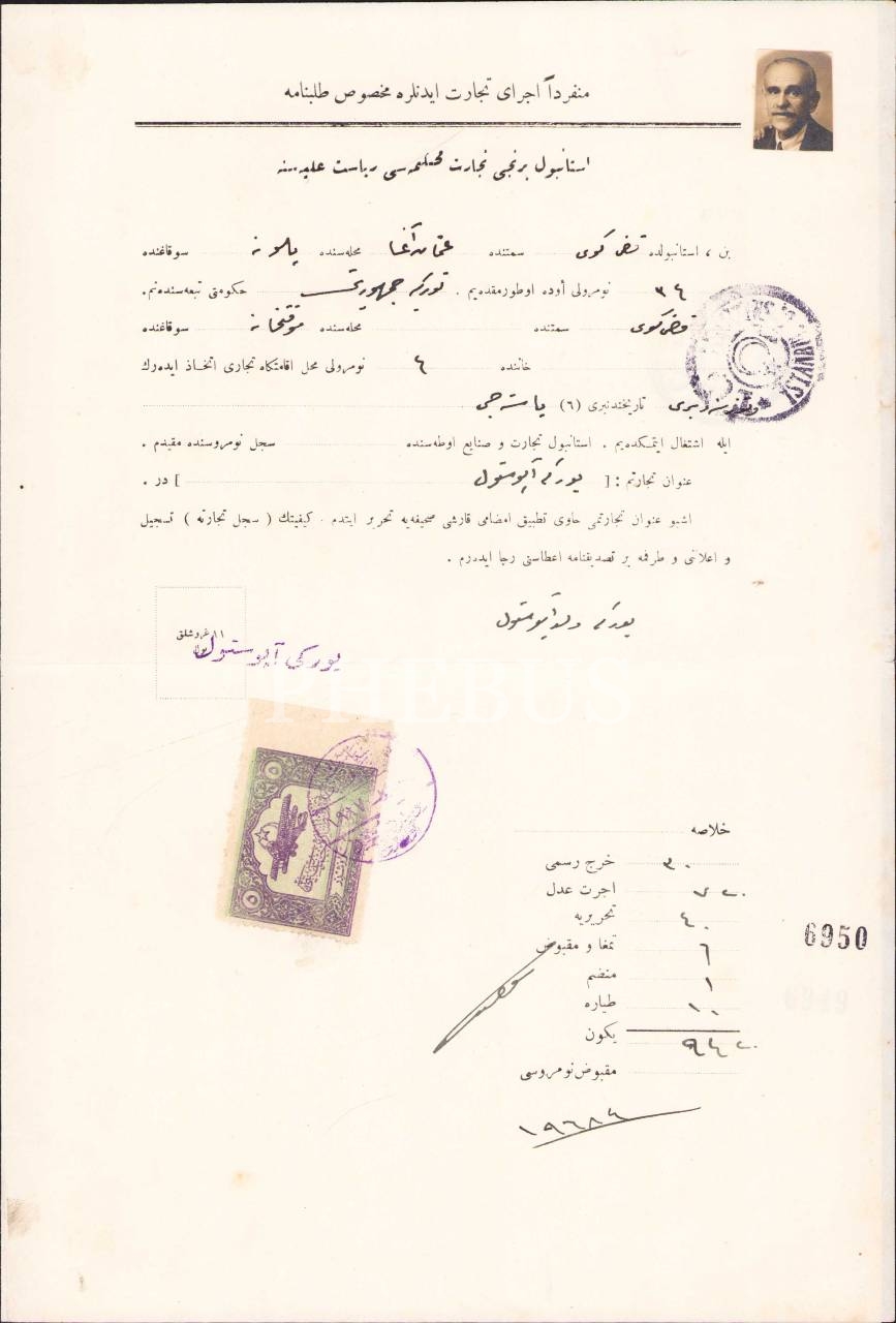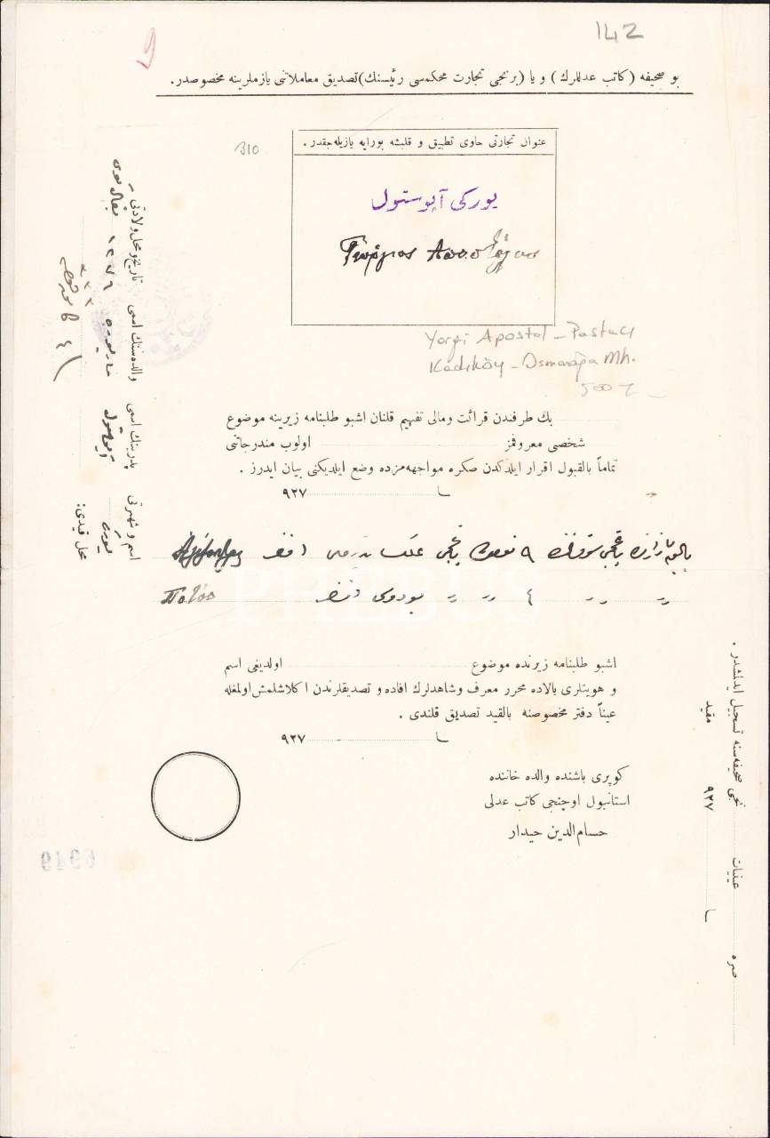 Osmanlıca ünferiden icra ticaret edenlere mahsus talepname, Pastacı Yorgi Apostal, Kadıköy Osmanağa Mahallesi, 21x30 cm