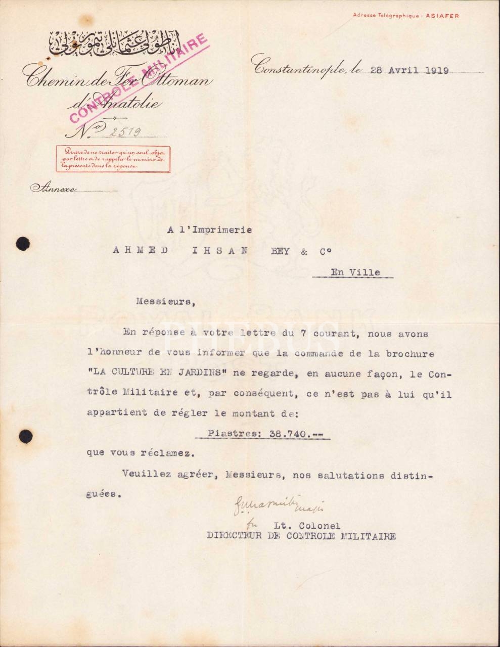 Osmanlıca Anadolu Osmanlı Demir Yolu - Constantinople antetli 1919 tarihli, evrak, 20x25 cm