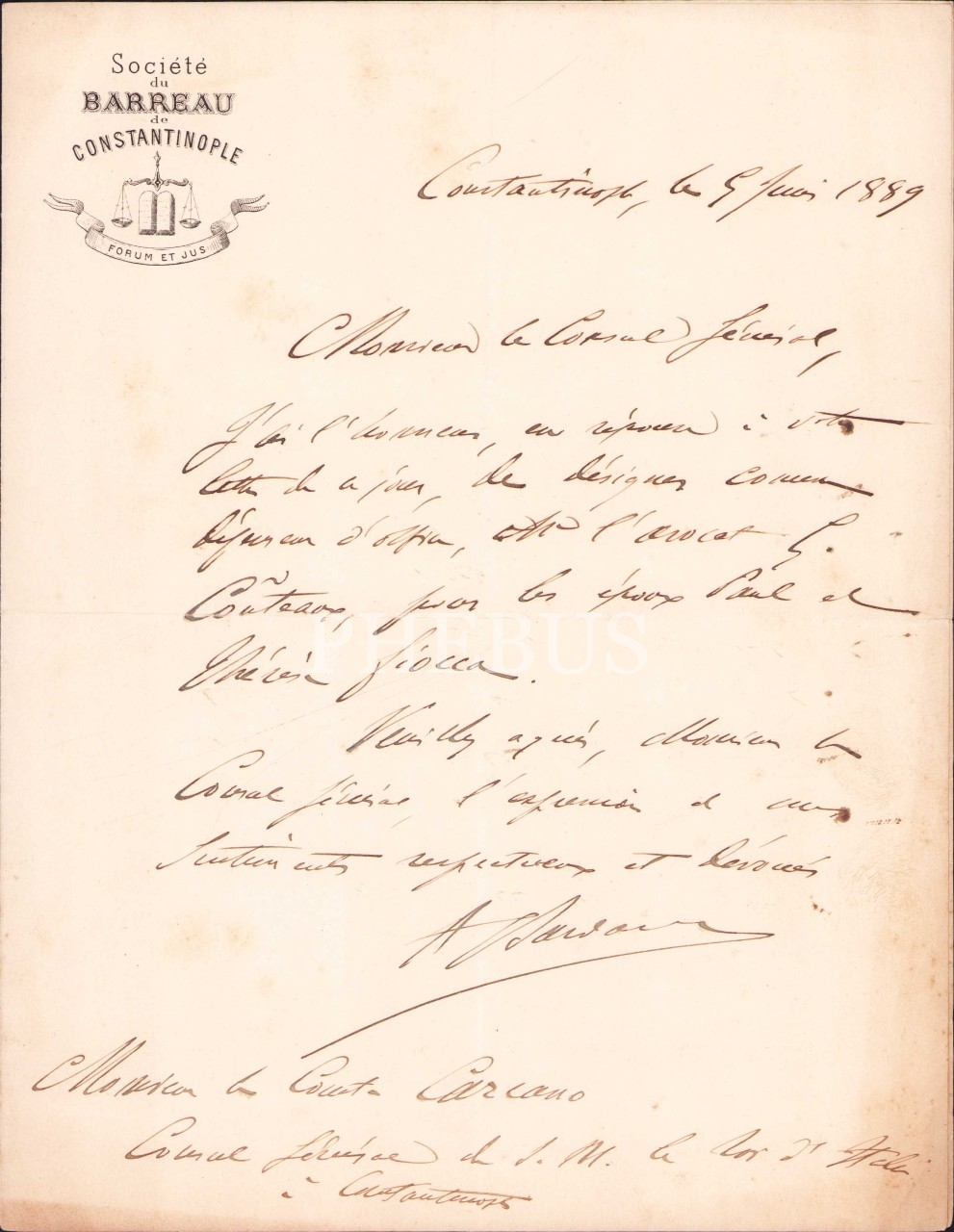 İstanbul Barosu antetli 1899 tarihli evrak, Constantinople, 4 sayfa, 21x27 cm
