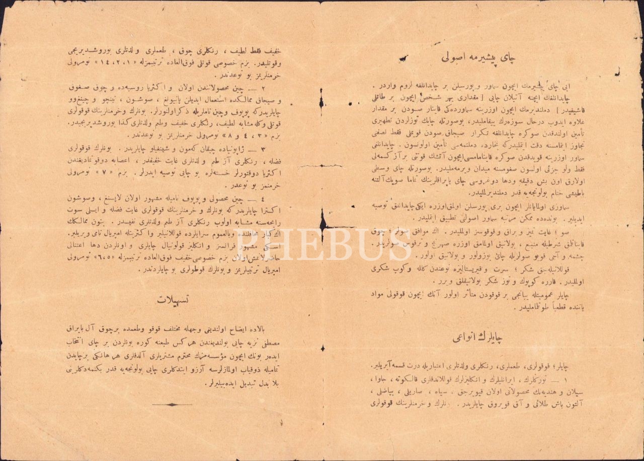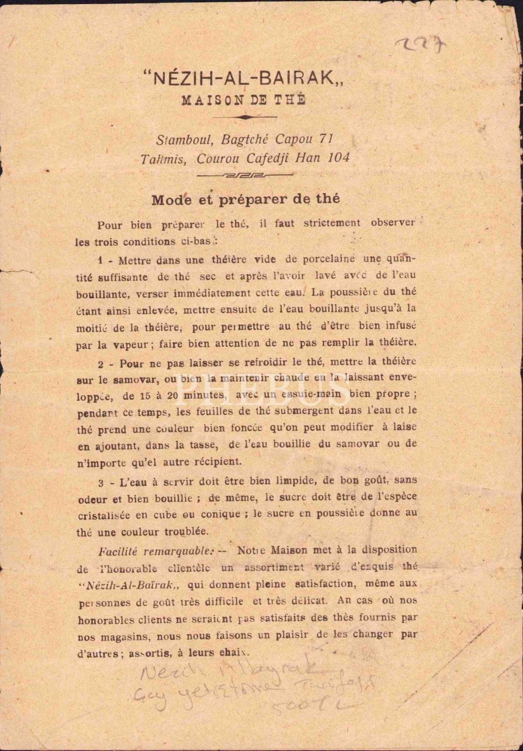 Osmanlı döneminde devlete ilk çayı getiren Albayrak - Mustafa Nezih'in Osmanlıca - Fransızca [Kutu ve Paketlere Mahsus] Çay Pişirme Tarifesi, Büyük Çay Deposu, Dokuzuncu baskı, Ahmed İhsan Matbaası, 1340, 8 sayfa, 15x21 cm